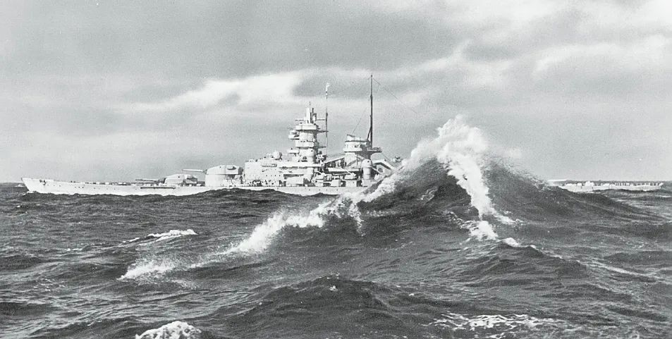图3 波涛中的“声望”。舰艏前倾,已埋入波涛。所有主炮转向舷侧。