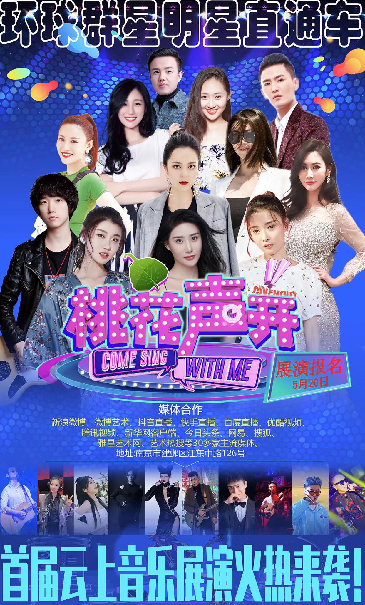 “桃花声开”云上数字歌手展演活动,由南京桃花里艺术机构运营,艺术热搜、北京环球群星文化艺术中心、艺术是药数字空间、光纬戏剧联合创意发起,南京胡桃里建邺分公司特别协办,TopHolder提供数字技术支持,通过线上和现场相结合的系列创意活动将拉开全程展演活动,为原创音乐、为民间“高手”发声嫁接全新的云上数字艺术平台。