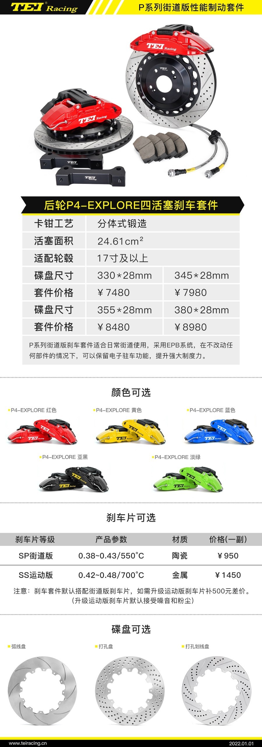 P4-Explore这款是专门为后轮电子驻车系统车型设计的最新产品,采用EPB系统,在不改动任何部件的情况下,可以保留电子驻车功能,提升制动力。一体性更强稳定性和安全性更高,安装便捷。活塞尺寸是 28mm*4,供油面积24.61cm²。看它外观小巧,但在上车后强强联手,必能发挥出不俗的制动力。