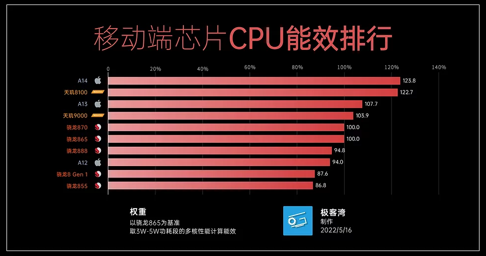 通过极客湾分享的移动芯片能效排行榜来看,以骁龙 865 为基准,取 3W-5W 功耗段多核性能计算能效,数据显示,苹果 A14 当之无愧的位于排行榜榜首,达到了 123.8。不过,第二名竟然是联发科的天玑 8100,以 122.7 的成绩相当接近第一名的苹果 A14,并且远超高通阵营,堪称安卓最节能处理器。