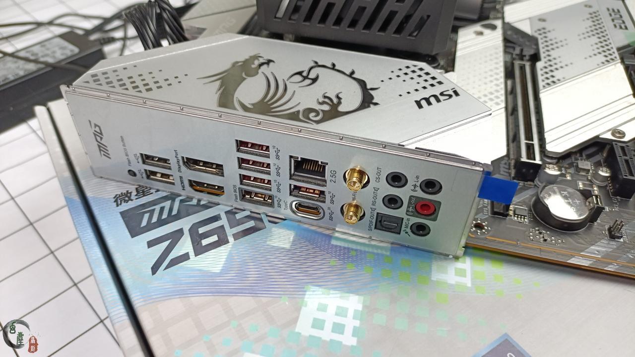 主板接口展示,算是刚刚够用吧,主板采用了一体式I/O挡板的设计。I/O接口从左到右分别是,两个传统的USB2.0接口、一个DP接口、一个HDMI接口,五个USB3.2 Gen 2 10Gbps(Type-A),一个USB3.2 Gen 2x2 20Gbps(Type-C)接口,一个2.5G有线LAN口,一组WIFI天线接口,以及一组音频接口。