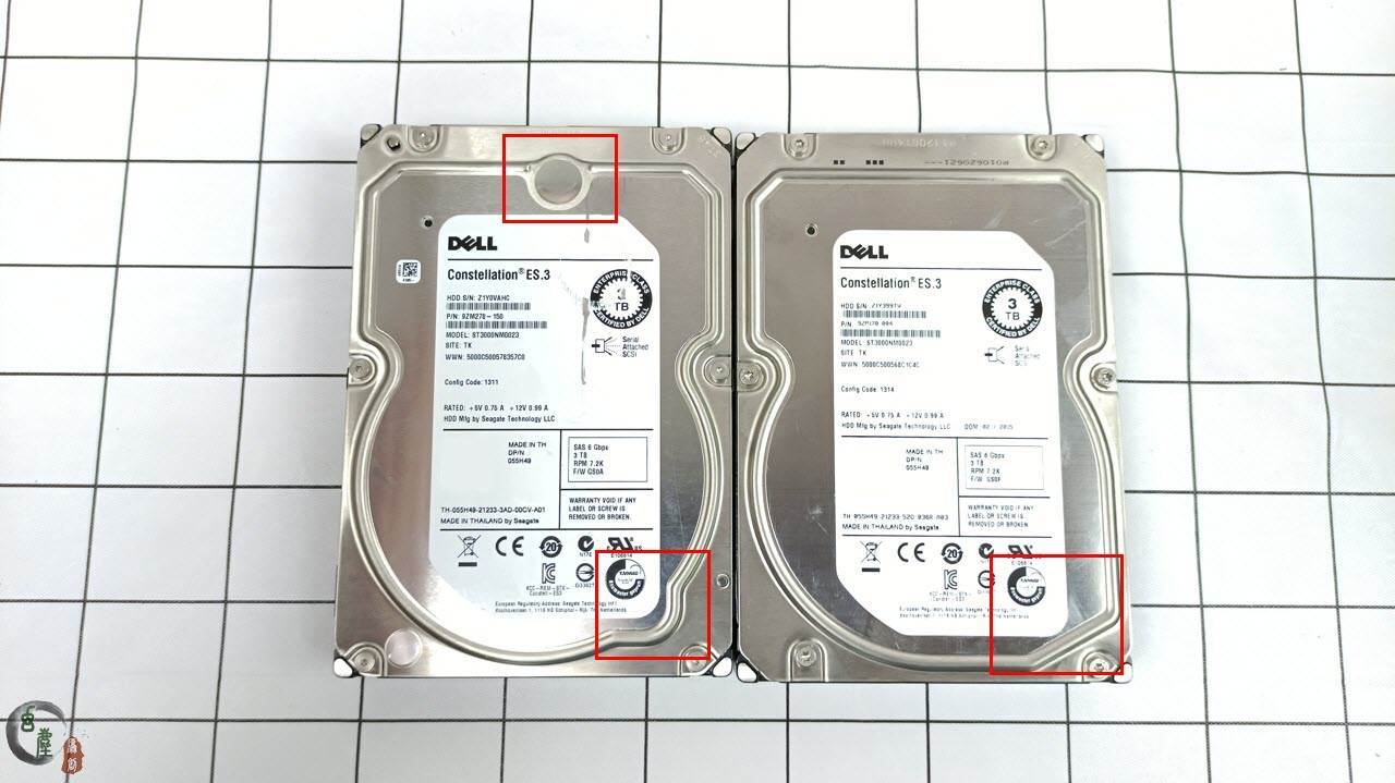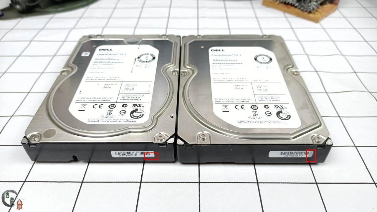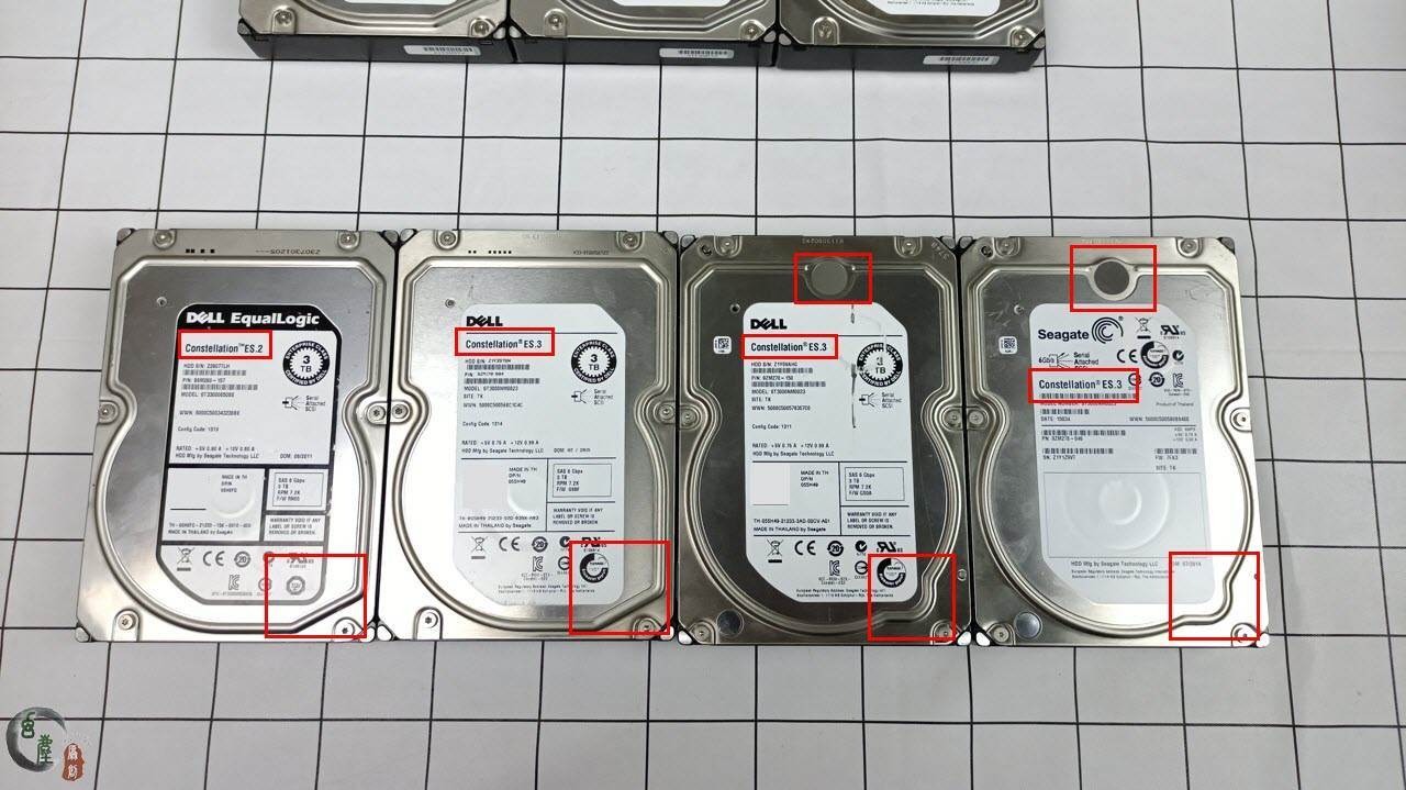 当然,如果商家把五块全弄上假标盘,我也依旧能识别出来。因为我手里,有真的ST3000NM0023硬盘,也有真的ST33000650SS硬盘。今天我就把它们放到一块,让大家好好对比一下,以免再中招。从左到右,第一块是ES.2 ST33000650SS DELL标的(真盘),第二块是ES.3 ST3000NM0023 DELL标的(假盘,本体是ES.2 ST33000650SS盘),第三块是ES.3 ST3000NM0023 DELL标的(真盘),第四块是ES.3 ST3000NM0023 希捷标的(真盘)。