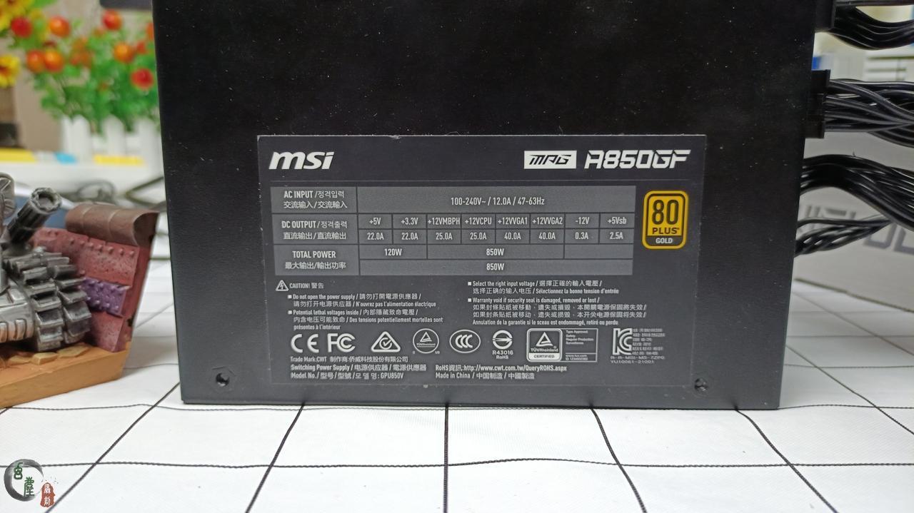 微星MPG A850GF电源,采用了四路12V输出,支持12V智能单轨联合输出,12V显卡输出为480W,12V CPU输出为300W。通过了80PLUS金牌认证,拥有十年质保。