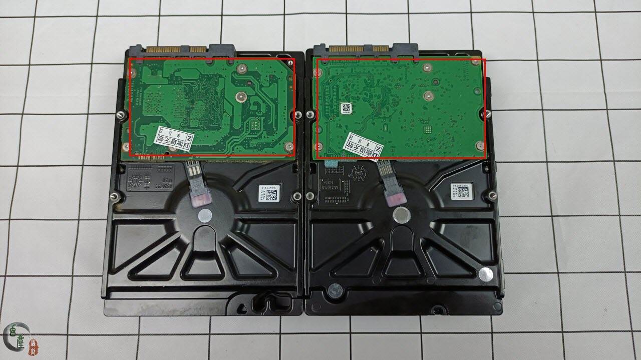 硬盘侧面的条码红框部分也不同,左边硬盘的条码是横着的,右边硬盘的条码是竖着的。这个不同,大家可以忽略,因为商家可以很方便地修改标签。