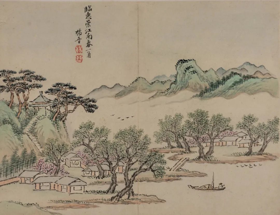 此幅题为临惠崇江南春图,可谓老笔纷披,苍中毓秀,直入化境,集古人大成而自出机杼。作品描绘江南水村风光,景观可居可游,茂林修竹、杨柳坡岸、远渚归渔、茅舍小阁,均是夏日清幽自在之境,沁人心脾。