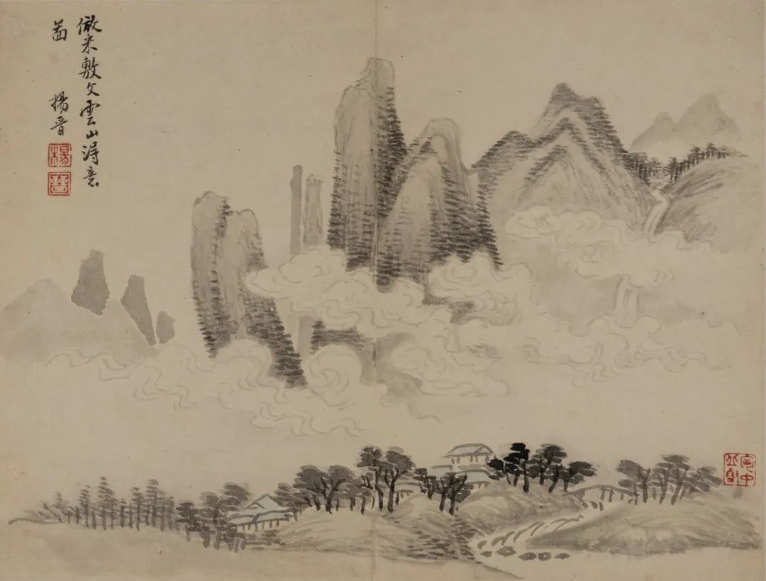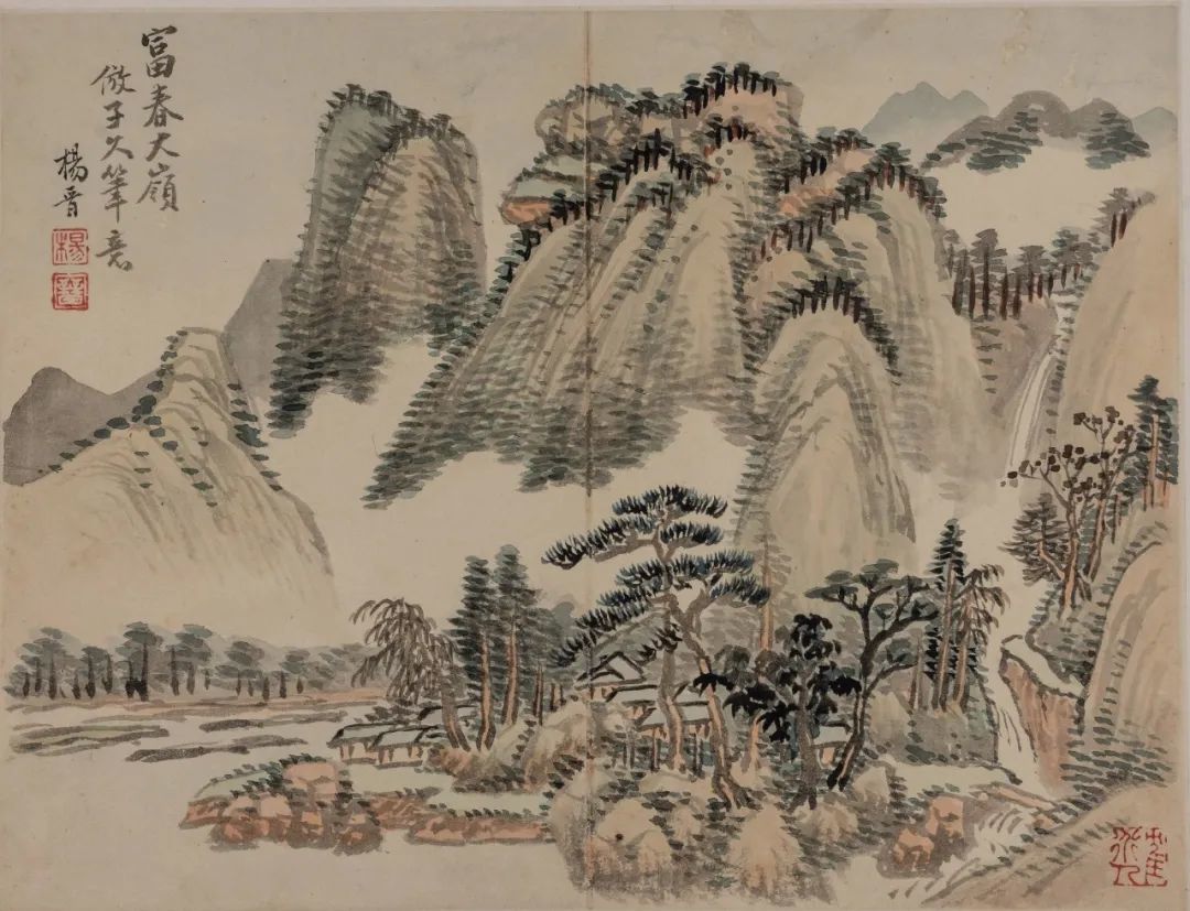 此开为仿黄子久《富春大岭》,江流映带、烟云缥缈,山容树态、苍苍茫茫,丘壑体貌则尽出己意,虽同样用披麻皴,却一变黄公望的长皴劲斫为细笔短皴,仿佛毫不着力而气韵淳厚。