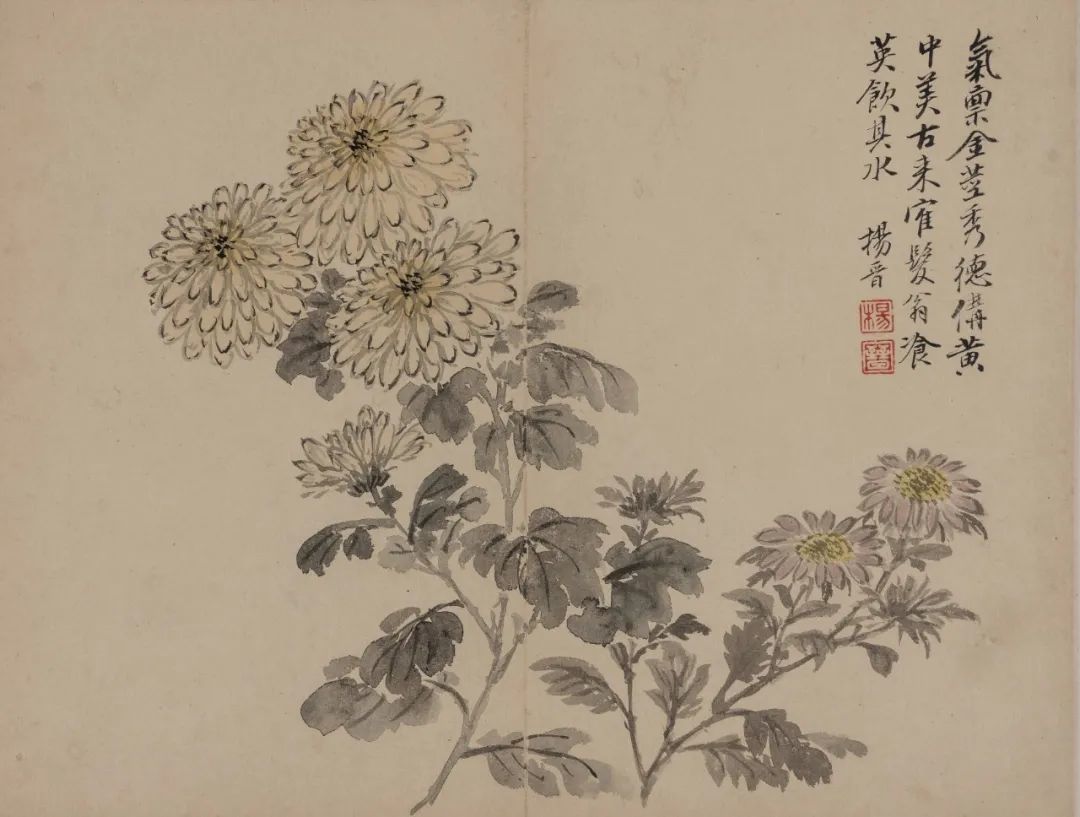 此幅作东篱秋霜,为拟陈白阳画法,一花半叶,淡墨欹毫,自有疏斜历乱之致。所谓“清霜下篱落,佳色散花枝。载咏南山句,幽怀不自持。”正是陈淳笔下独立疏离的写照。