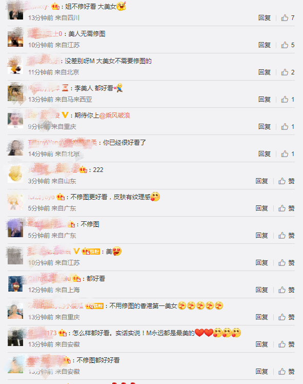 看到李嘉欣的自拍美照后,网友们也齐齐留言:“没差别呀,大美女不需要修图的”、“不修图更好看,皮肤有纹理感”、“怎么样都好看,实话实说,M永远是最美的”。