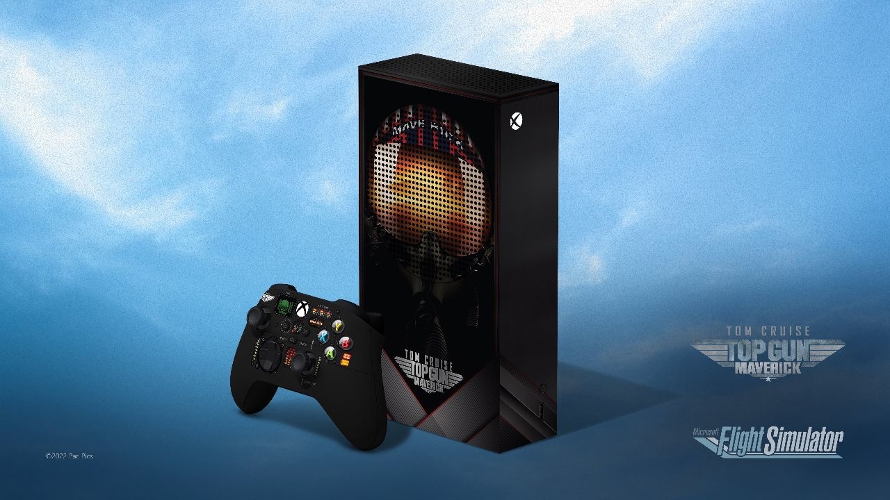 从微软官方的图片可以看到,联名款 Xbox Series S 主机印有电影名称,以及飞行员头盔样式,Xbox 手柄则设计成了类似飞机仪表盘的造型,看起来还是比较炫酷的。
