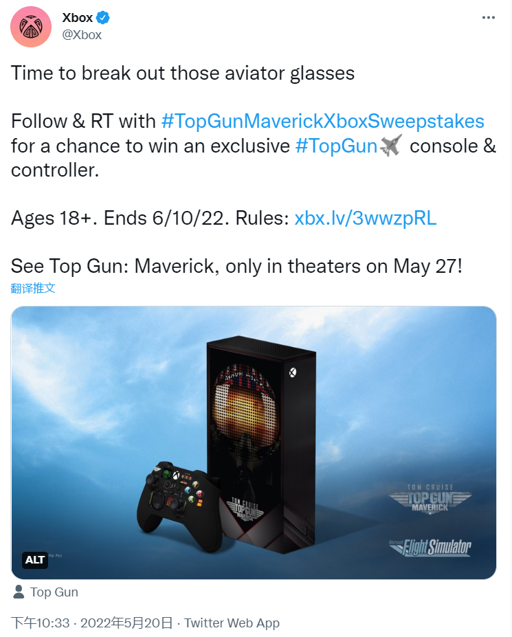 IT之家 5 月 22 日消息,微软 Xbox 官推近日公布了一款《壮志凌云 2:独行侠》联名款 Xbox Series S 主机,和往常一样大家过过眼瘾,该主机不公开售卖,只能通过抽奖获得。