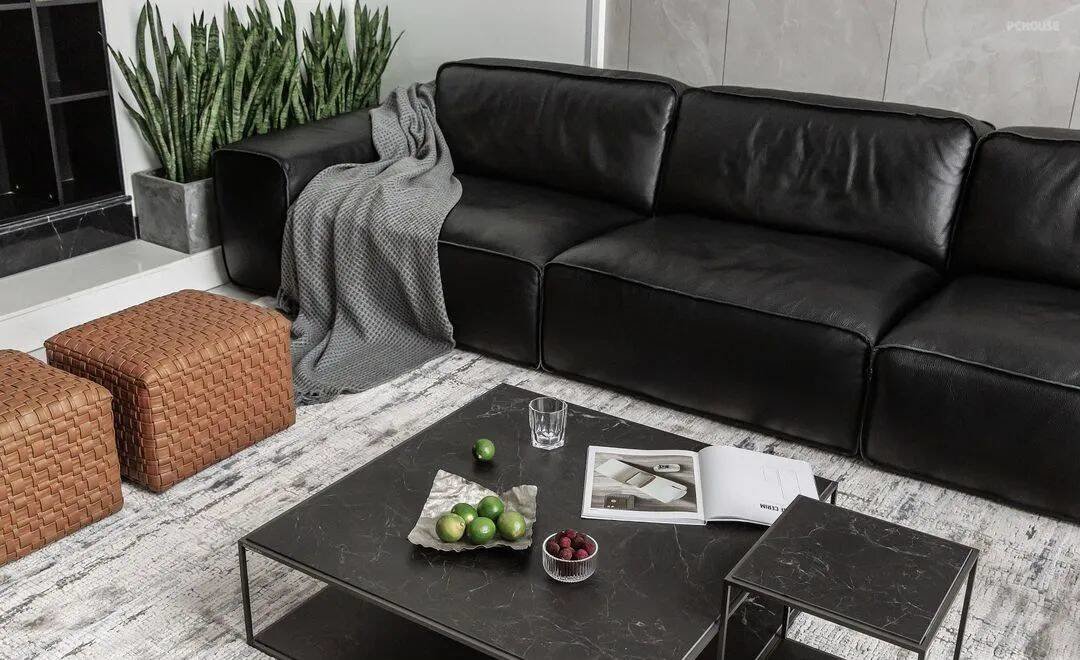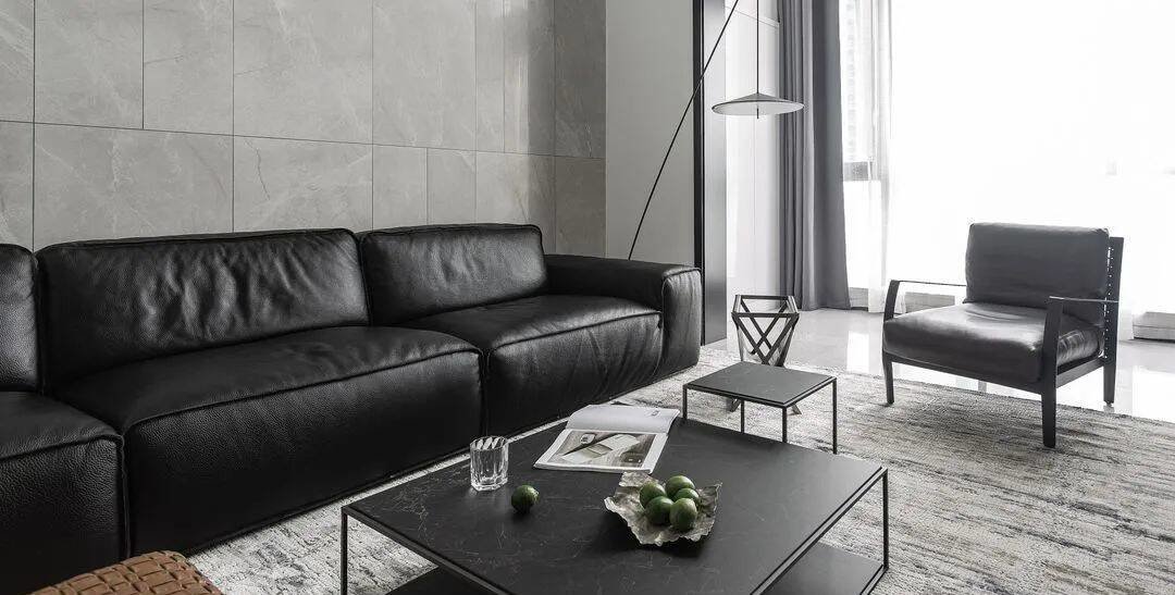 客厅沙发围合摆放,布局开阔大气,一字型黑色主沙发来自夏图,线条规整利落,用色沉稳,皮质奢华,引领视觉焦点。