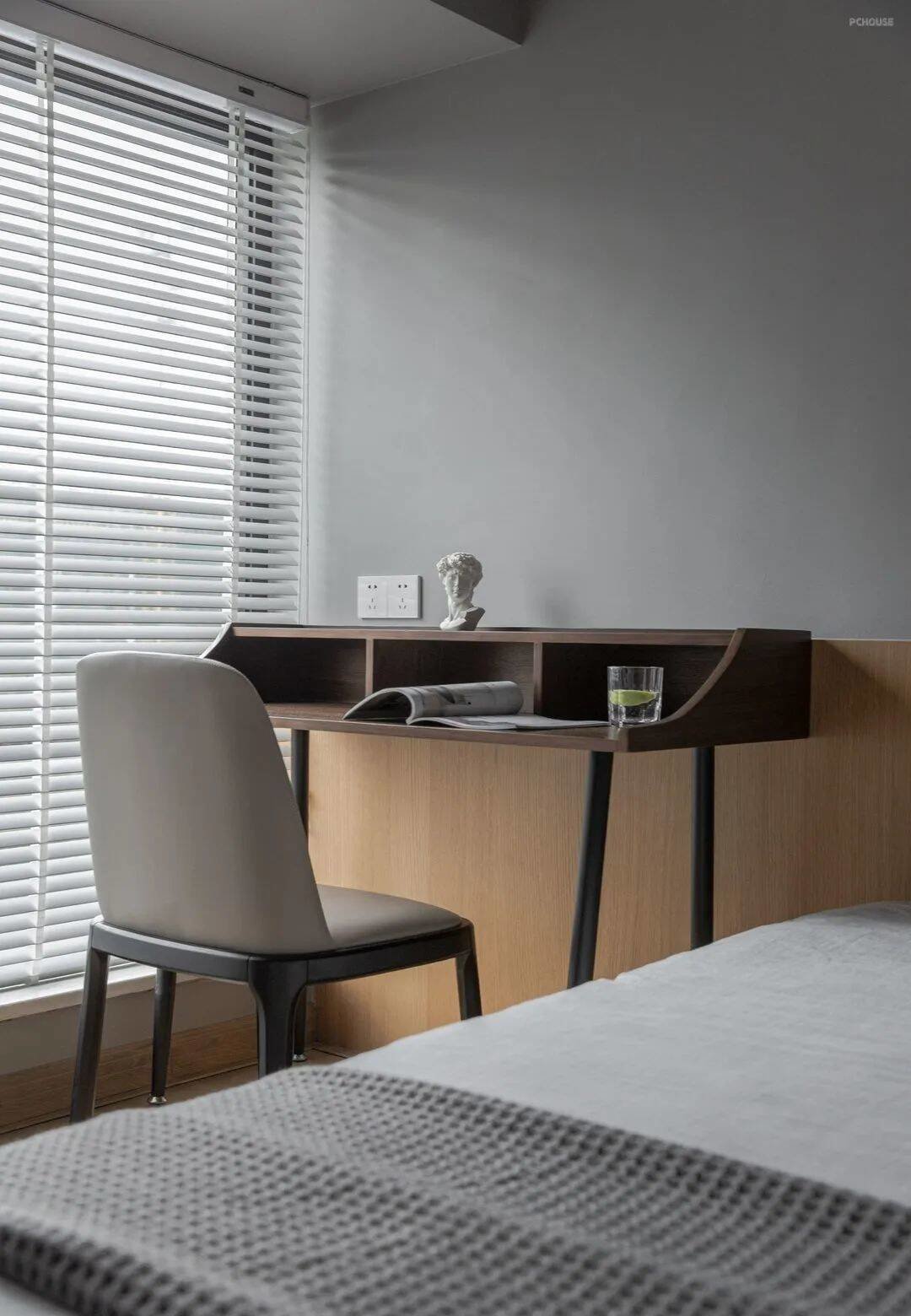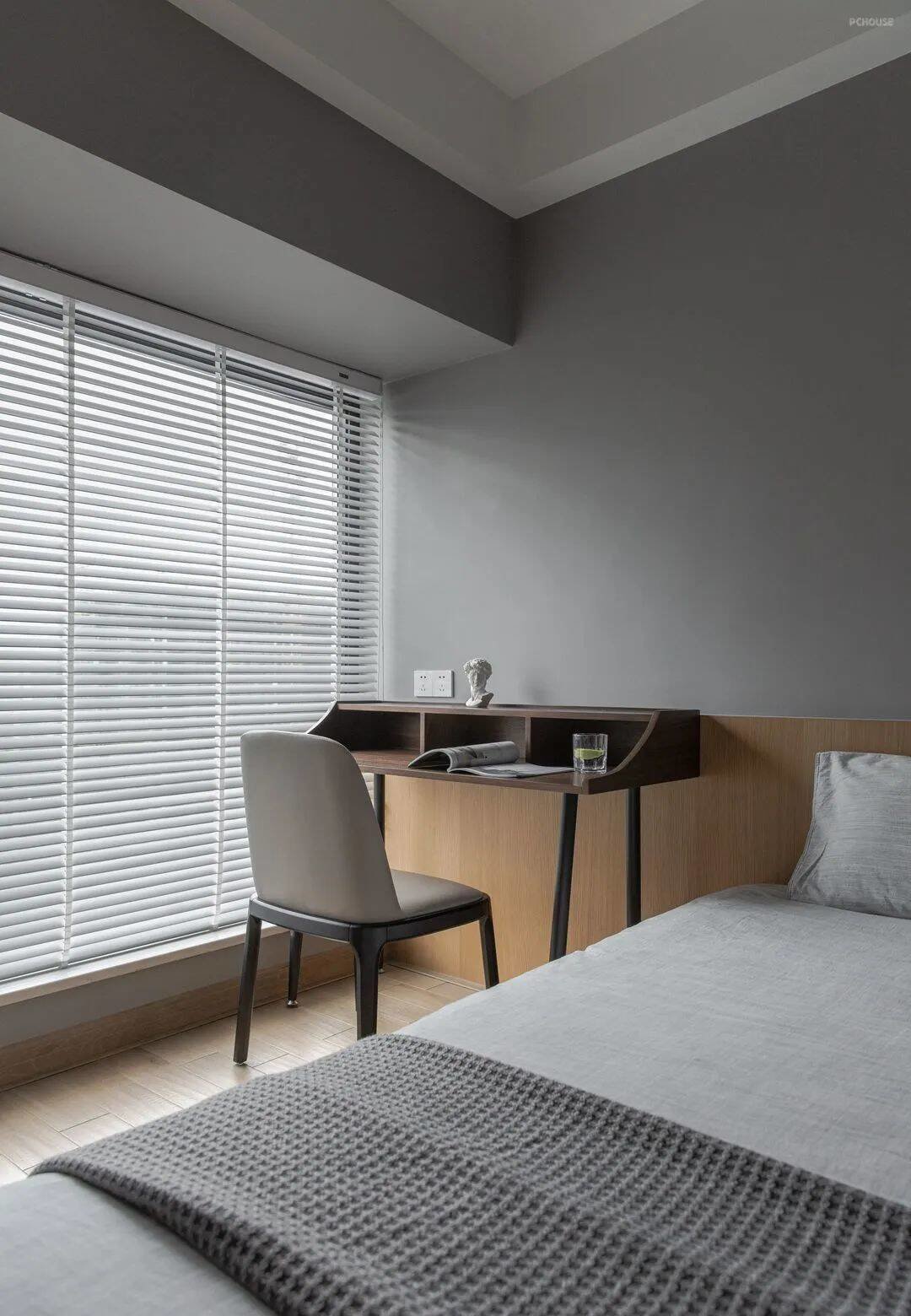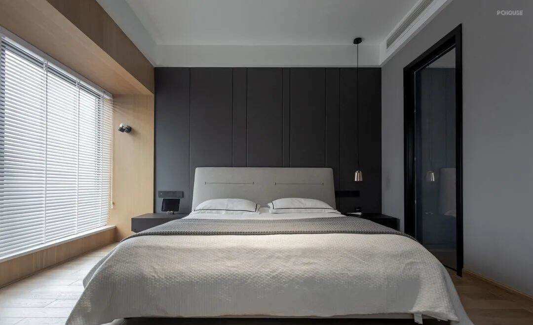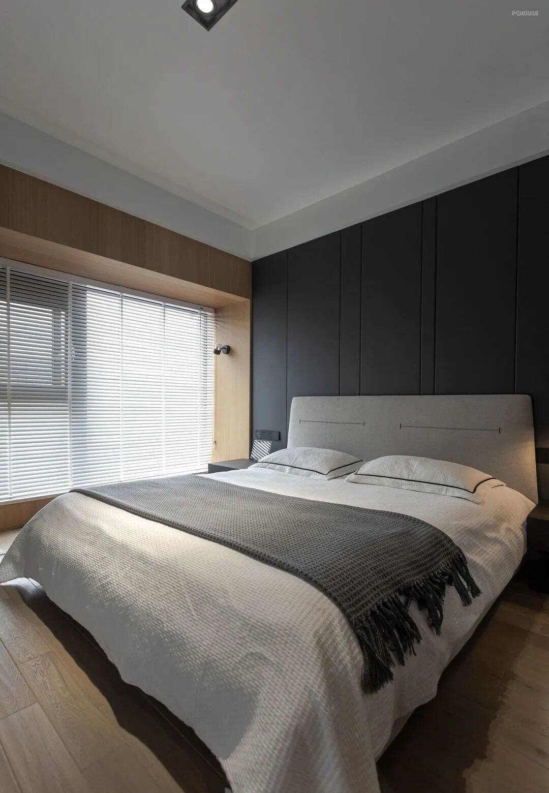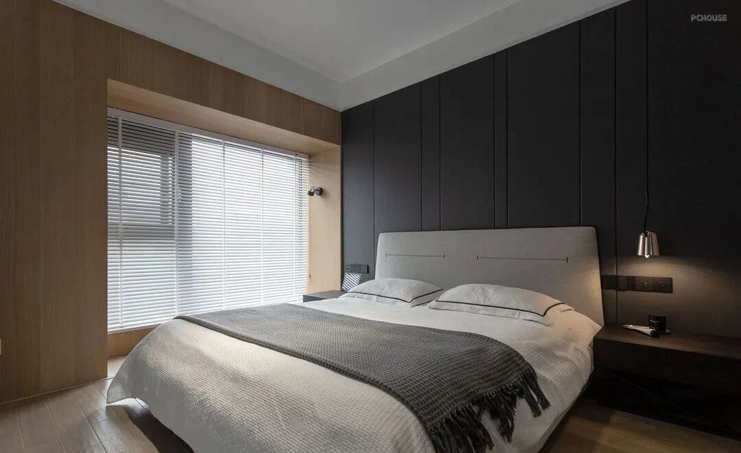 黑、灰、木三种色块相互交织,主卧的质感极为简洁清爽,敲掉卧室飘窗,纳入更多空间给睡眠区,形成开阔布局,从而营造无负担的睡眠氛围。