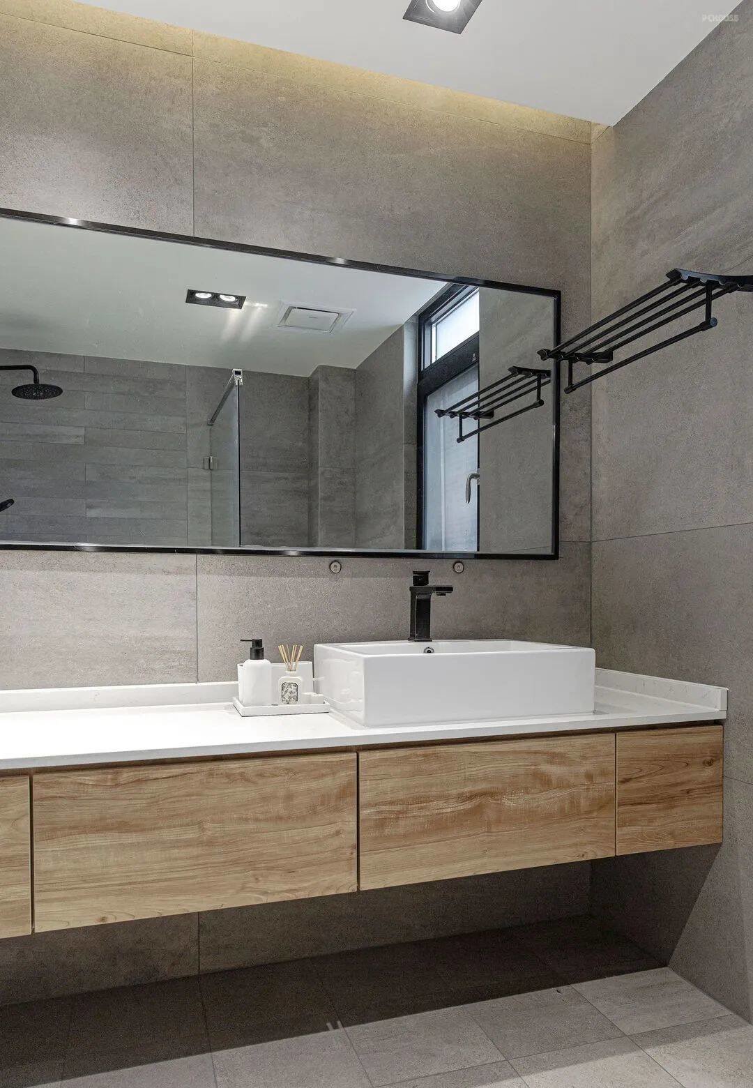 这是一楼屋主女儿的专属卫浴,墙地面统铺灰色哑光地砖,耐脏还能提亮空间。超长的洗手台,将化妆、洗漱空间合二为一,悬空设计,可轻松避开卫生死角。