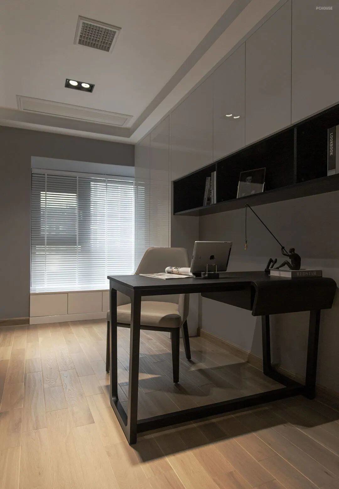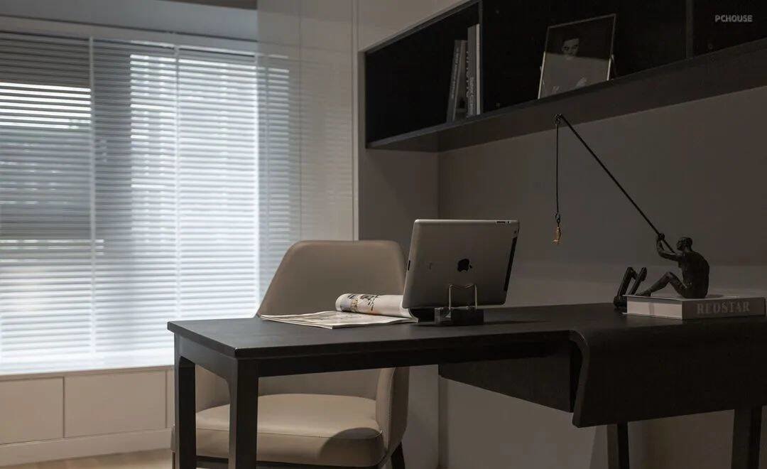 书房的陈设相对简单,保留宽敞飘窗,同样安装百叶帘,空间更有情调,飘窗底部设计有储物抽屉,休闲与收纳功能兼顾。