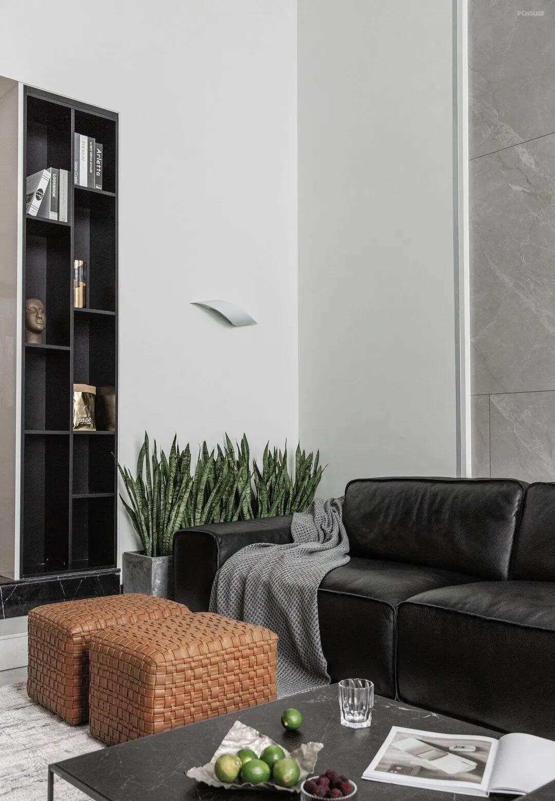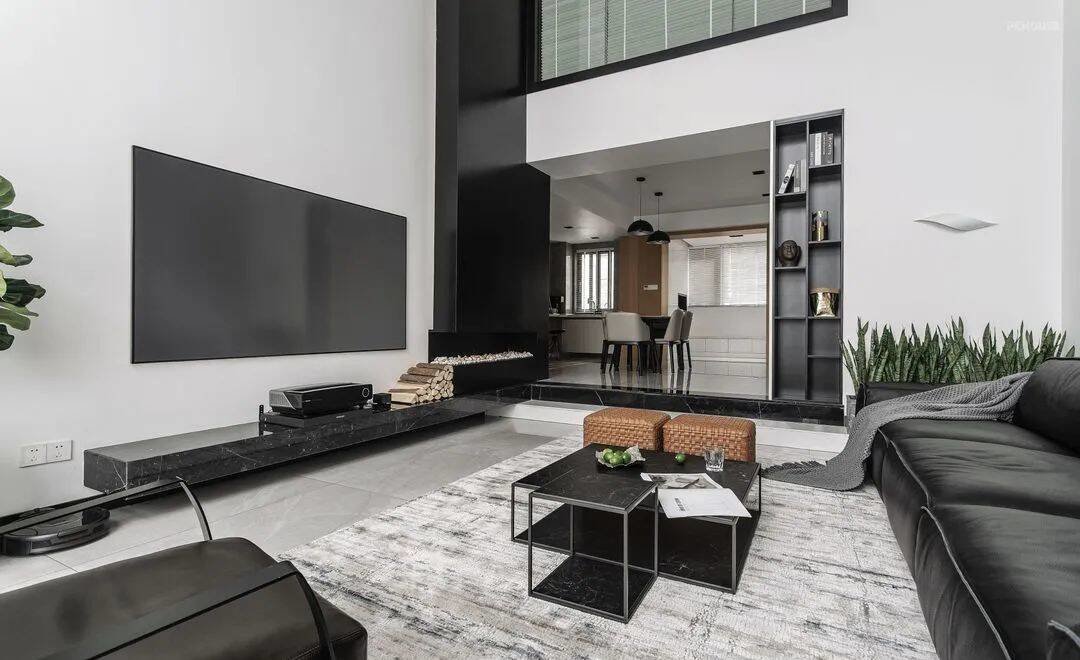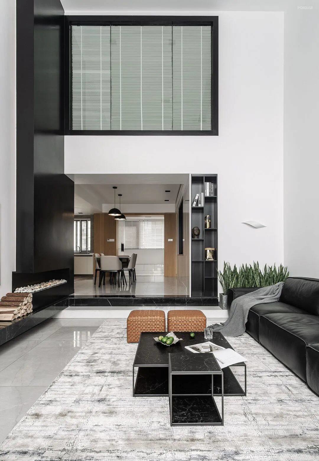 屋主偏好开阔的家居氛围,设计师将客厅挑空,同时利用下沉设计手法,将层高拔升至5米,尽显大气格调。经典的黑白灰配色,层次分明,简约而不失时尚感。