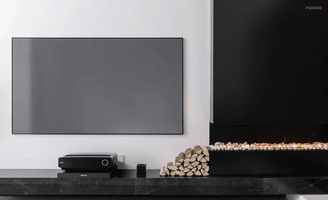 超大屏电视内嵌于纯白电视背景墙,删繁就简,利用鲜明的色调对比,营造视觉美感。