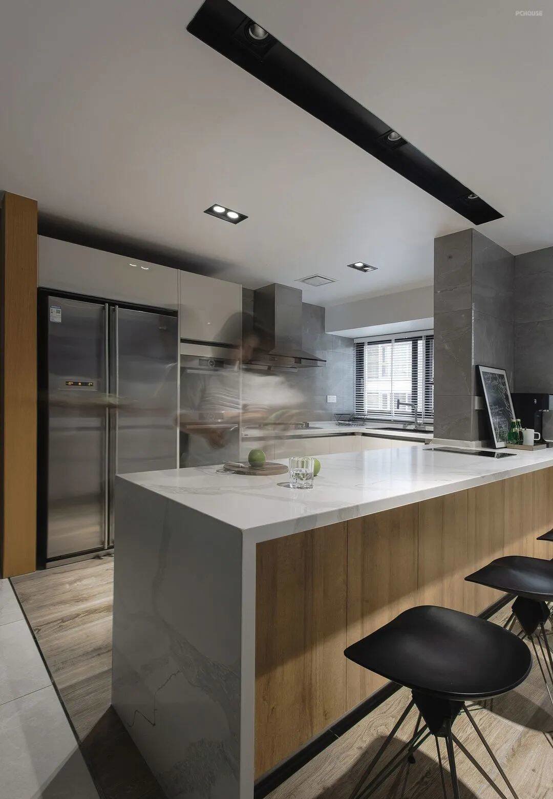 拆掉靠近餐厅侧的软体墙,改用岩板吧台代替,营造互动式餐厨空间,一人烹煮不再孤单。