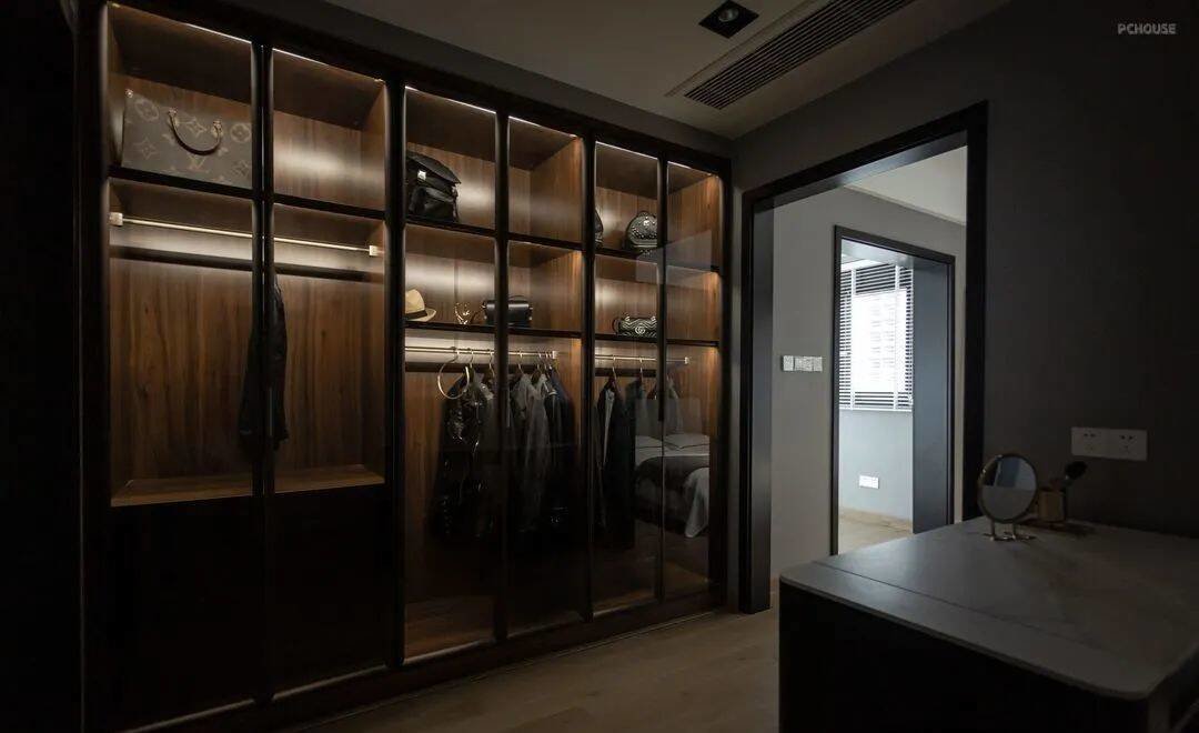 穿过主卧的玻璃推门,就来到较大的一个步入式衣帽间。顶天立地的衣柜统一安装玻璃门,并划分出包包区、挂衣区,对面定制了一个岩板首饰柜,收纳屋主日常的手表、珠宝配饰,空间划分得井井有条。