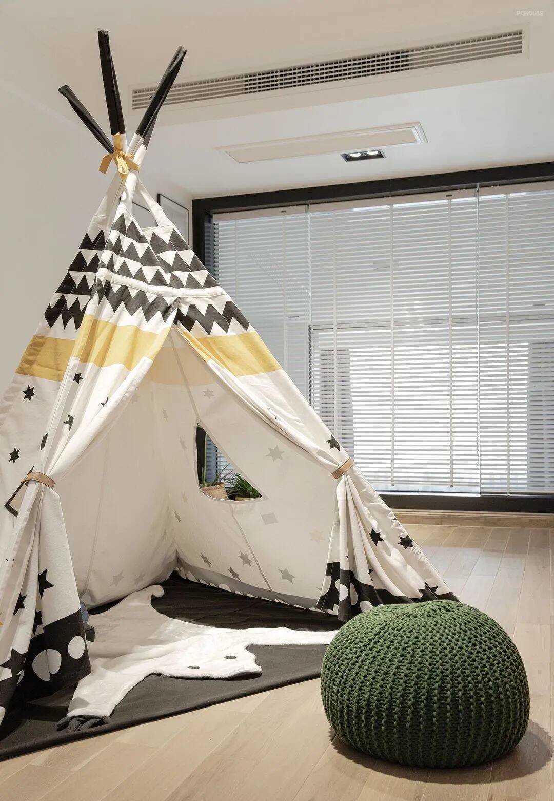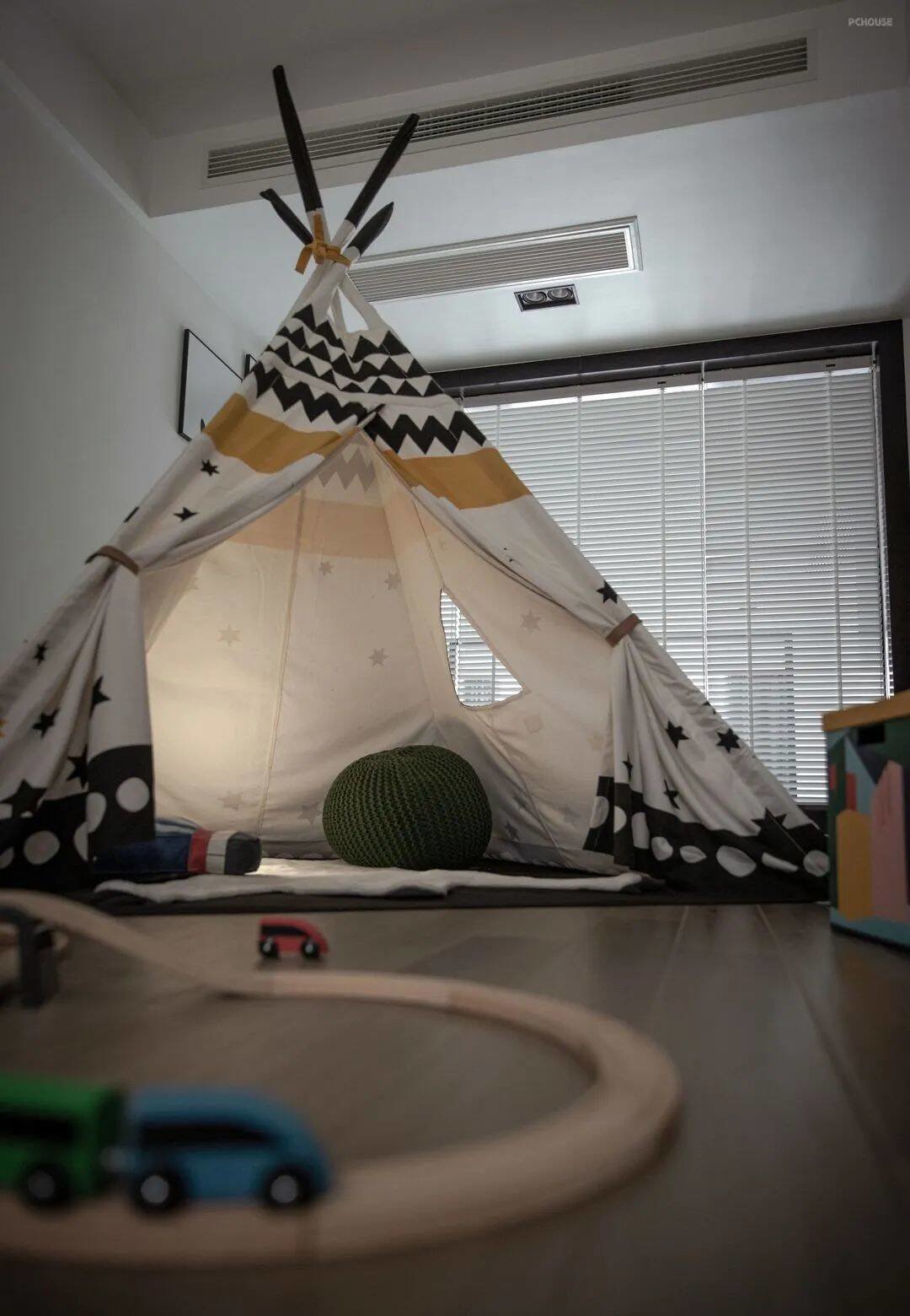 屋主夫妻还为孩子精心挑选了可爱的小帐篷、毛绒玩具和火车轨道玩具,守护小朋友的那份童趣和天真。