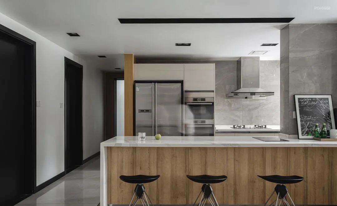 沟通过后,设计师以经典黑、白、木为空间主调,渲染出空间的高级与纯粹感,同时对局部空间进行了优化调整:舍去一间卧室,获得更宽敞的开放式餐厨,女屋主可安心大展烹饪技能。