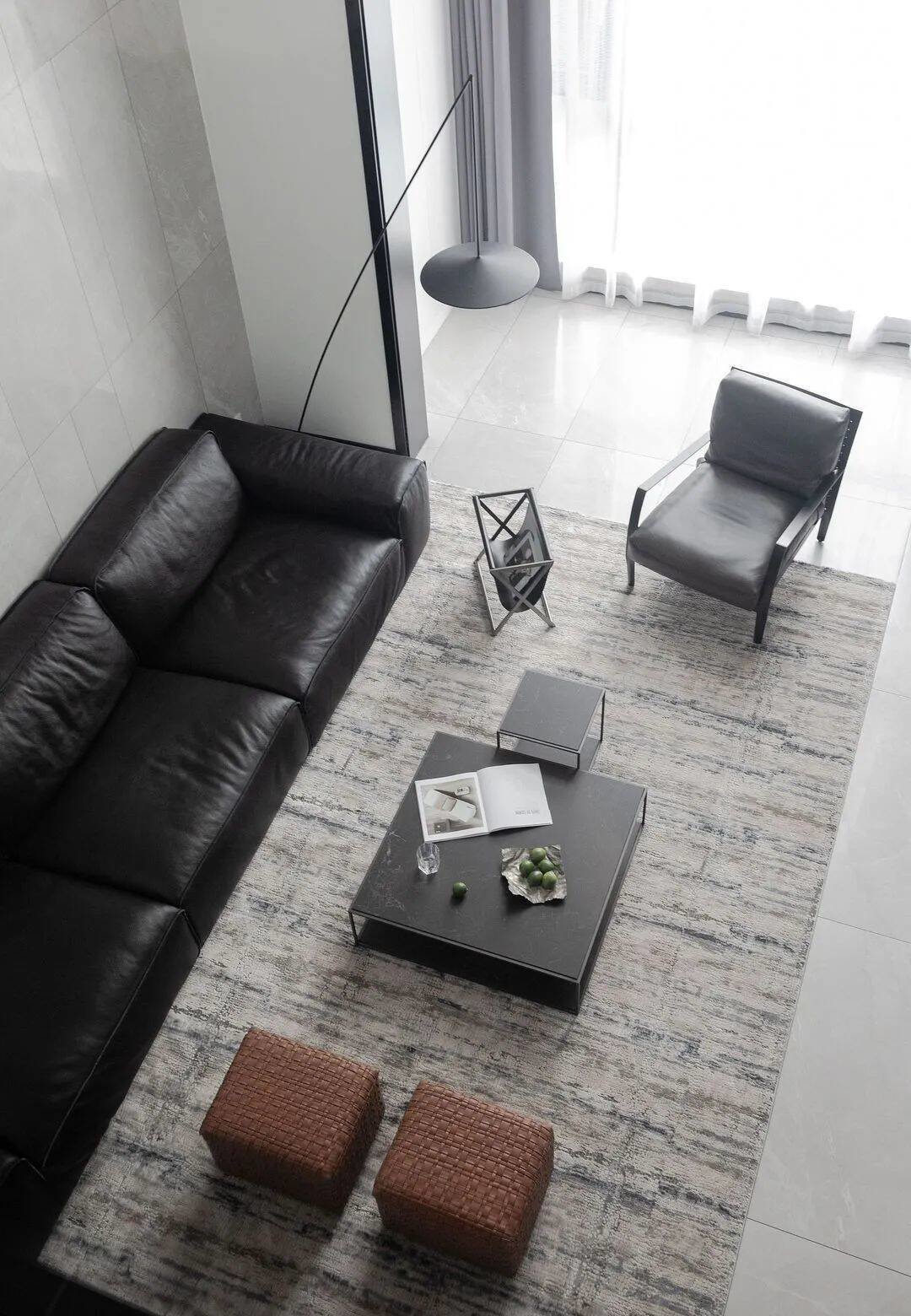 客厅、阳台通铺灰色地砖,力求扩大整体视觉观感,同时铺装大面灰色地毯,大人与孩子均可光脚在客厅活动,释放天性。