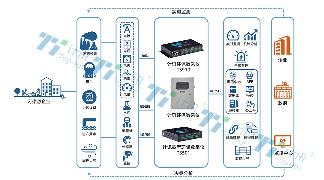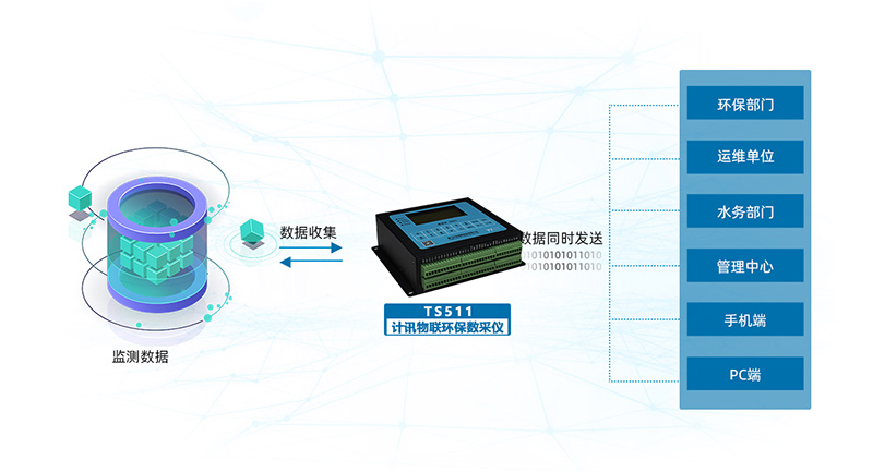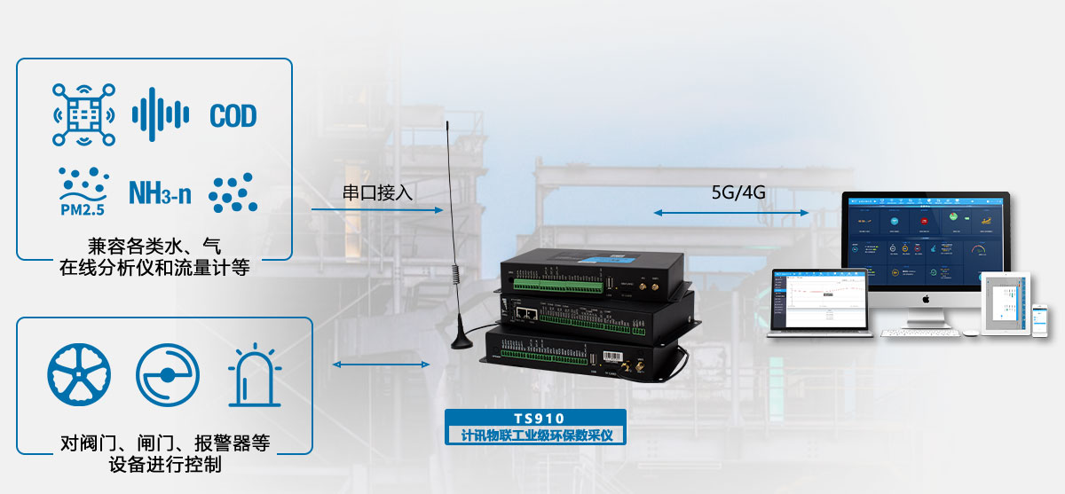 8、环保数采仪为核心,对接监测设备及上位机,实现污水、废气排放工况监控、仪器仪表日志、状态、参数、视频数据采集、存储、实时传输、报警联动、远程控制等,联网环保部门、污染源企业、其它三方云平台。