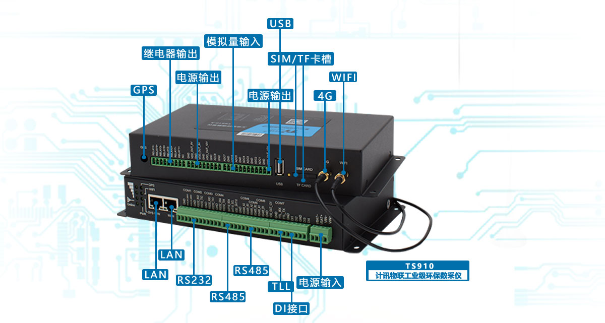 l 丰富接口,WAN/LAN、RS232接口、RS485接口、I2C接口、TTL电平串口、开关量输入接口、 模拟量输入接口、继电器输出、电源输出等可兼容采集多种传感设备采集需求;