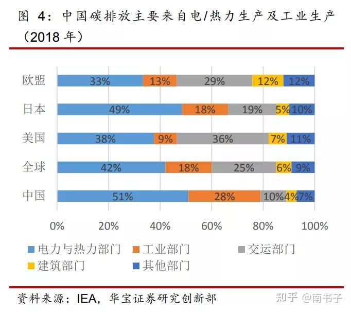 电力行业是碳排放交易市场的先行军。电热力生产及工业集中用煤、交通领域大量耗油是导致中国碳排放量较大的主因。根据英国BP的2019年数据,中国93%的碳排放来自于化石燃料的使用,其中68% 来自于固体燃料如煤炭,23%来自于液体燃料如石油等,9%来自于气体燃料如天然气等。