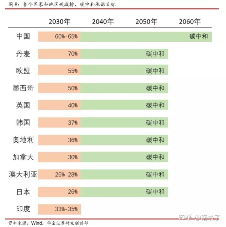 中国选择采取碳定价机制来实现碳排放、碳中和承诺。截止2020年4月,全球实行碳排放权交易政策的国际气候协议缔约国有31个,其余包括欧盟、韩国、加州等。实行碳税政策的缔约国有30个,主要位于北欧、日本、加拿大。各个国家和地区碳减排、碳中和承诺目标: