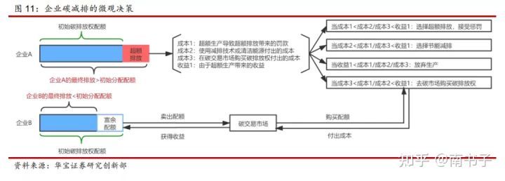 碳排放交易市场,是指将碳排放的权利作为一种资产标的,来进行公开交易的市场。也就是说,碳交易的核心是将环境“成本化”,借助市场力量将环境转化为一种有偿使用的生产要素,将碳排放权这种有价值的资产作为商品在市场上交易。至于碳市场的运行机制,首先,政府确定整体减排目标,采取配额制度,先在一级市场将初始碳排放权分配给纳入交易体系的企业,企业可以在二级市场自由交易这些碳排放权。其次,受到经济激励、减排成本相对较低的企业会率先进行减排,并将多余的碳排放权卖给减排成本相对较高的企业并获取额外收益。减排成本较高的企业则通过购买碳排放权来降低碳排放达标成本。按照华宝证券的分析,有效碳市场的碳排放权的价格就是企业的边际减排成本。在企业微观决策上,主要是将碳减排成本、超额碳排放成本、购买碳配额的成本与超额排放生产带来的收益进行比较,并作出相应决策。