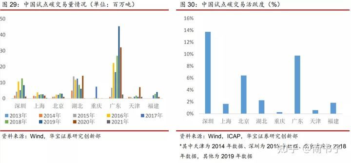 从价格上看,当前,全球碳排放价格处于上升趋势,各碳市场的碳价差别较大。据华宝证券,欧盟碳市场碳价最高,中国试点碳交易市场价格最低。华宝证券称,我国试点碳价历史最高点为122.97元/吨(深圳),最低点为1元/吨(重庆);欧盟EUA碳配额现货碳价历史最高点为47.91欧元/吨(折合人民币约380元/吨),最低点为2.68欧元/吨(折合人民币约22元/吨)。截止4月29日,我国碳试点碳价为 5.53-42.02元/吨之间(其中深圳碳市场碳价最低,为6.44元/吨,北京最高,为47.6元/吨),而同一天,欧盟EUA 碳配额现货结算价为47.91欧元/吨(折合人民币约380元/吨),为我国碳试点碳价的9-68倍。