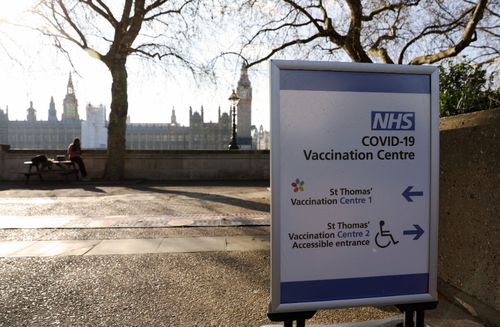 3月27日,疫苗接种中心指示牌被放置在英国伦敦议会大厦对面的泰晤士河畔。新华社记者李颖摄