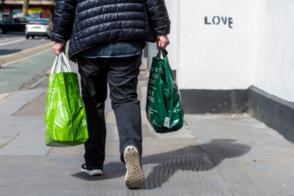 4月13日,在英国伦敦,一名男子手提购物袋走在路上。新华社发(史蒂芬·程摄)