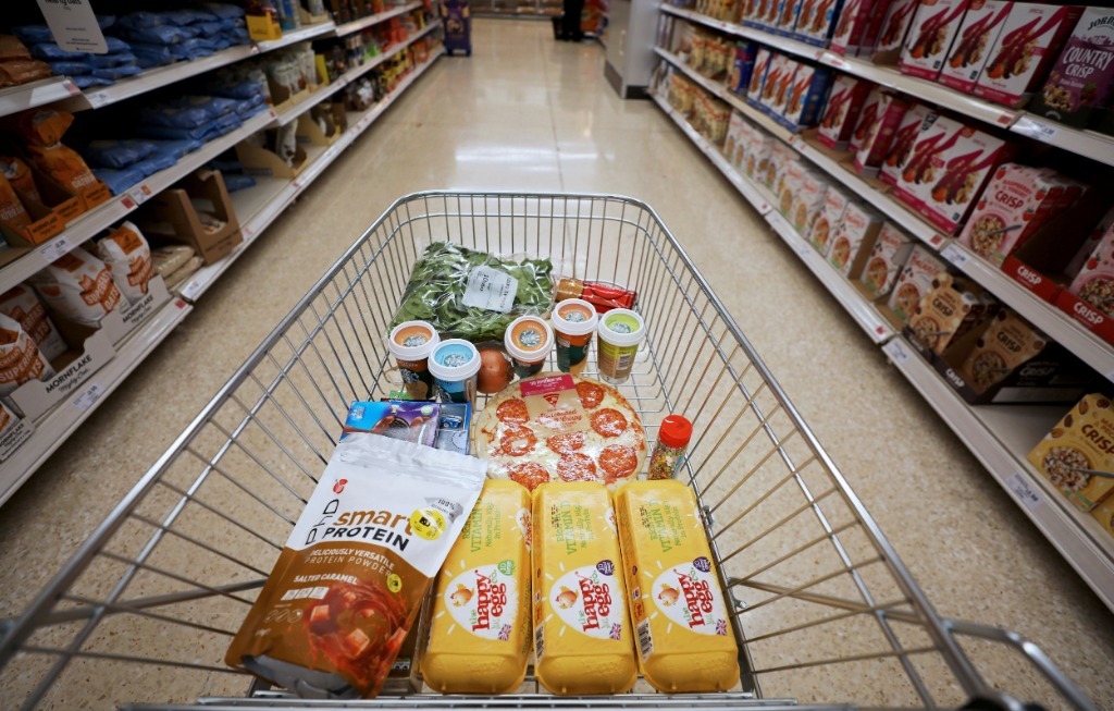 这是5月5日在英国伦敦一家超市拍摄的装有食品的购物车。新华社记者李颖摄