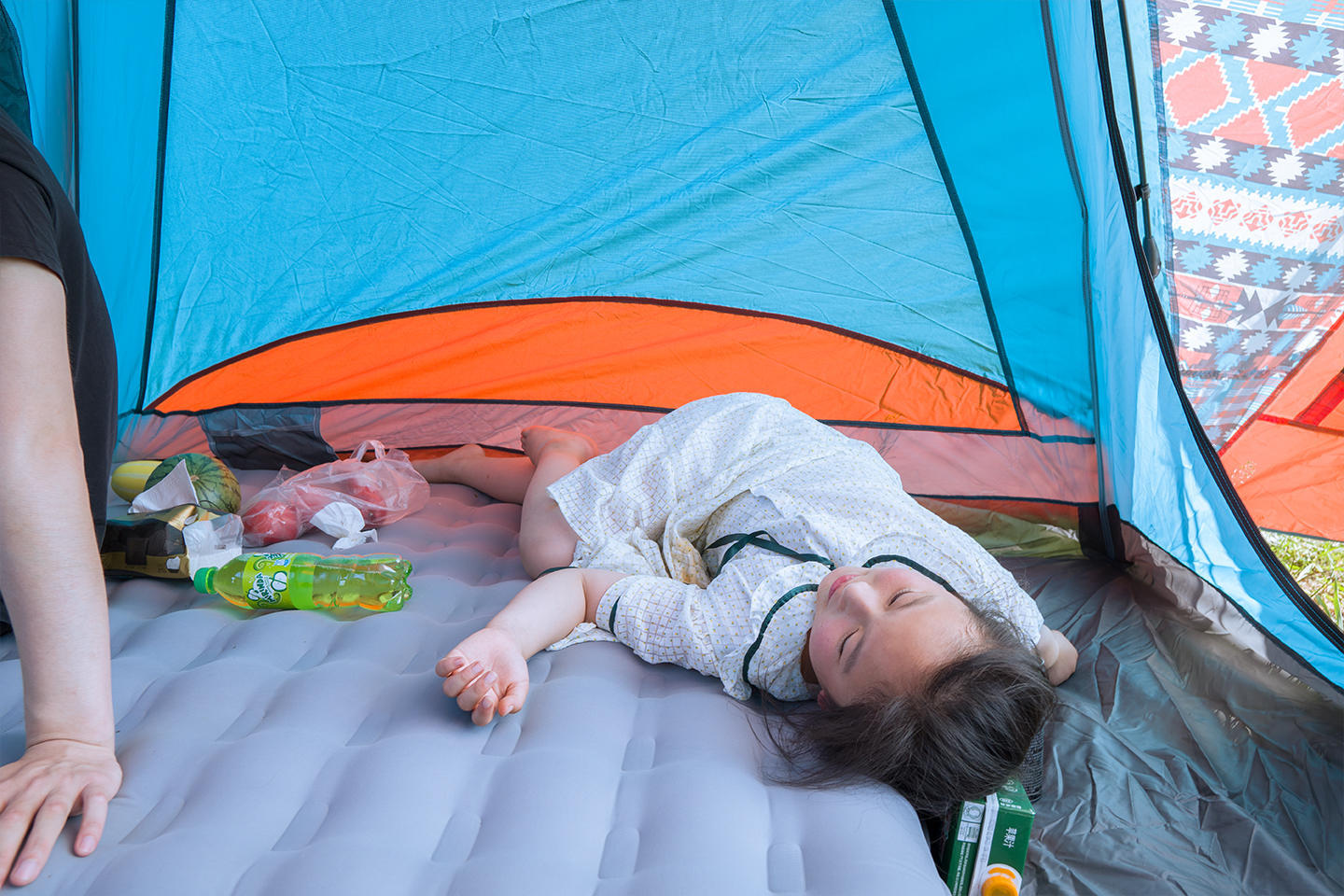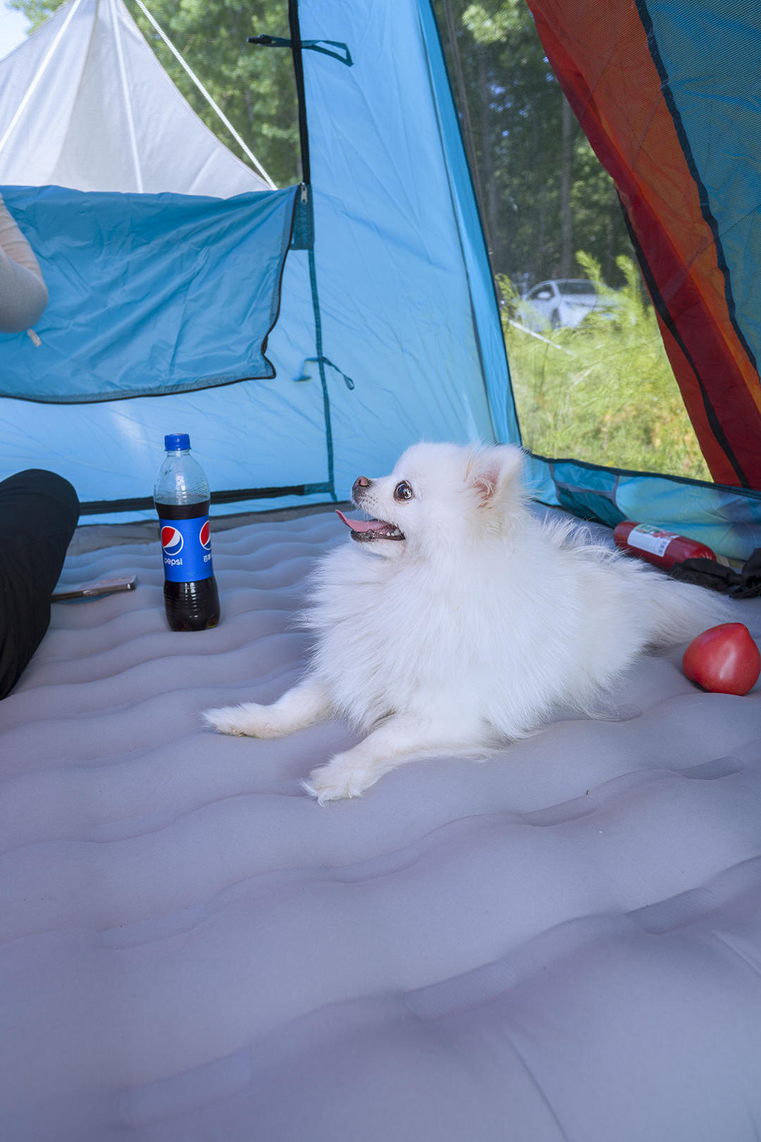 我第一次搭建帐篷之后,又立马入手充气床垫,原因是纯帐篷的底面不平,坐着躺着非常硌人,想休息一会根本睡不着。迪卡侬这款充气床垫的尺寸是2*1.4m的,放在图途绿巨人帐篷内大小正好,缺的一块可以放点杂物、伸伸腿。