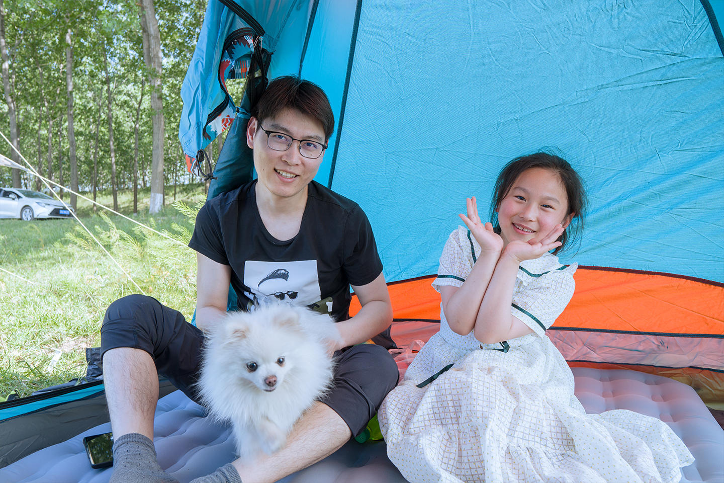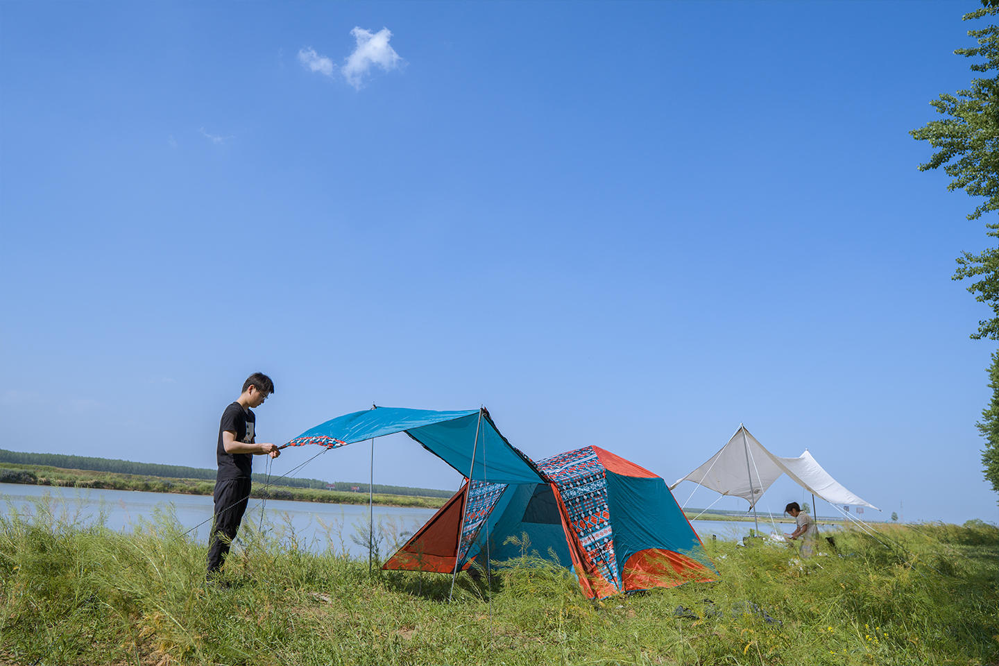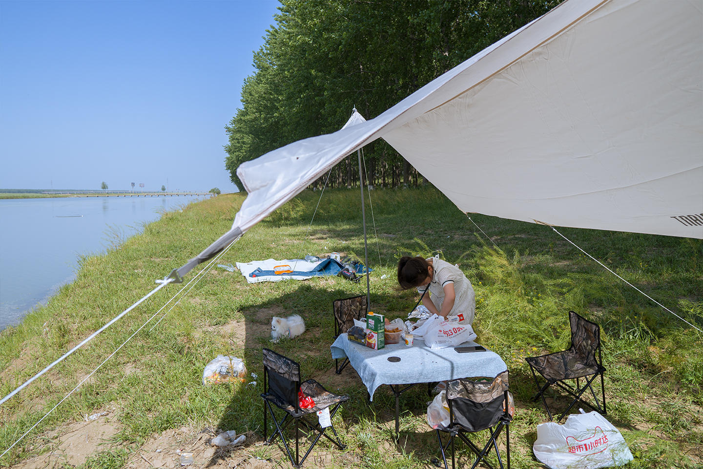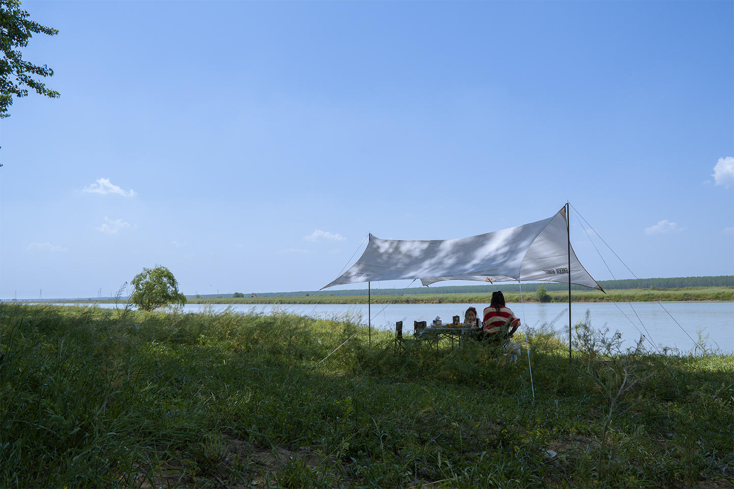 树下不好野餐,在空地上搭个天幕自然再好不过了,阳光下蚊虫少,通风足,视野通透,坐一会神清气爽。