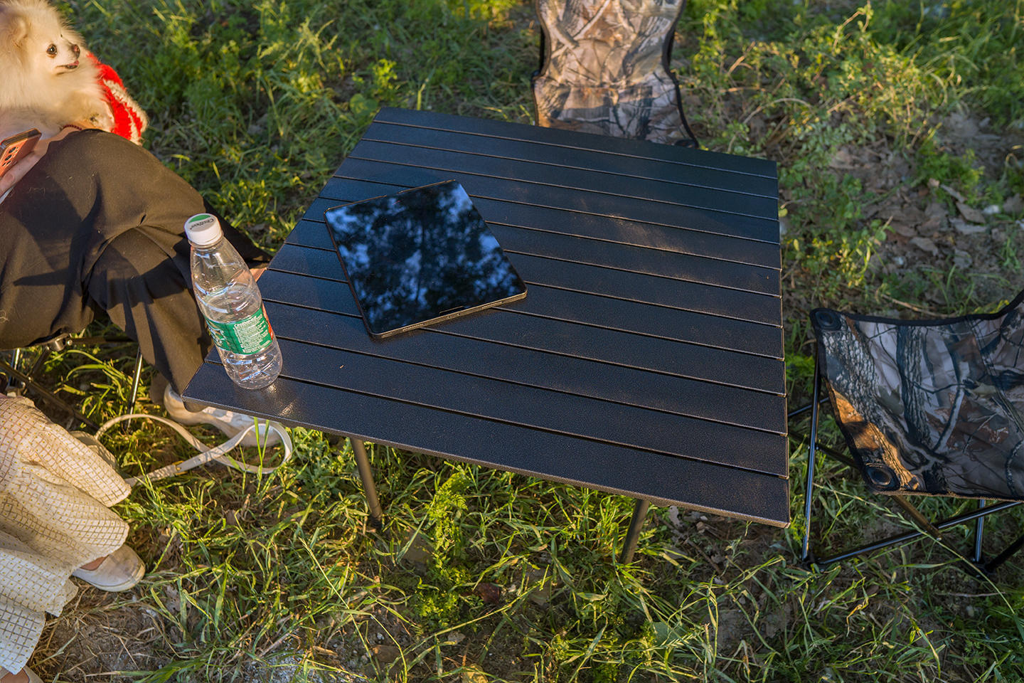 桌子木方使用了铝合金烤漆桌面,大颗粒磨砂质感,桌板之间使用高弹筋连接,两侧拉伸即可取下,桌腿部分使用了铆钉加固,可折叠也能很稳定。小桌子尺寸为70*70*48cm,四个成年人围一圈刚好。