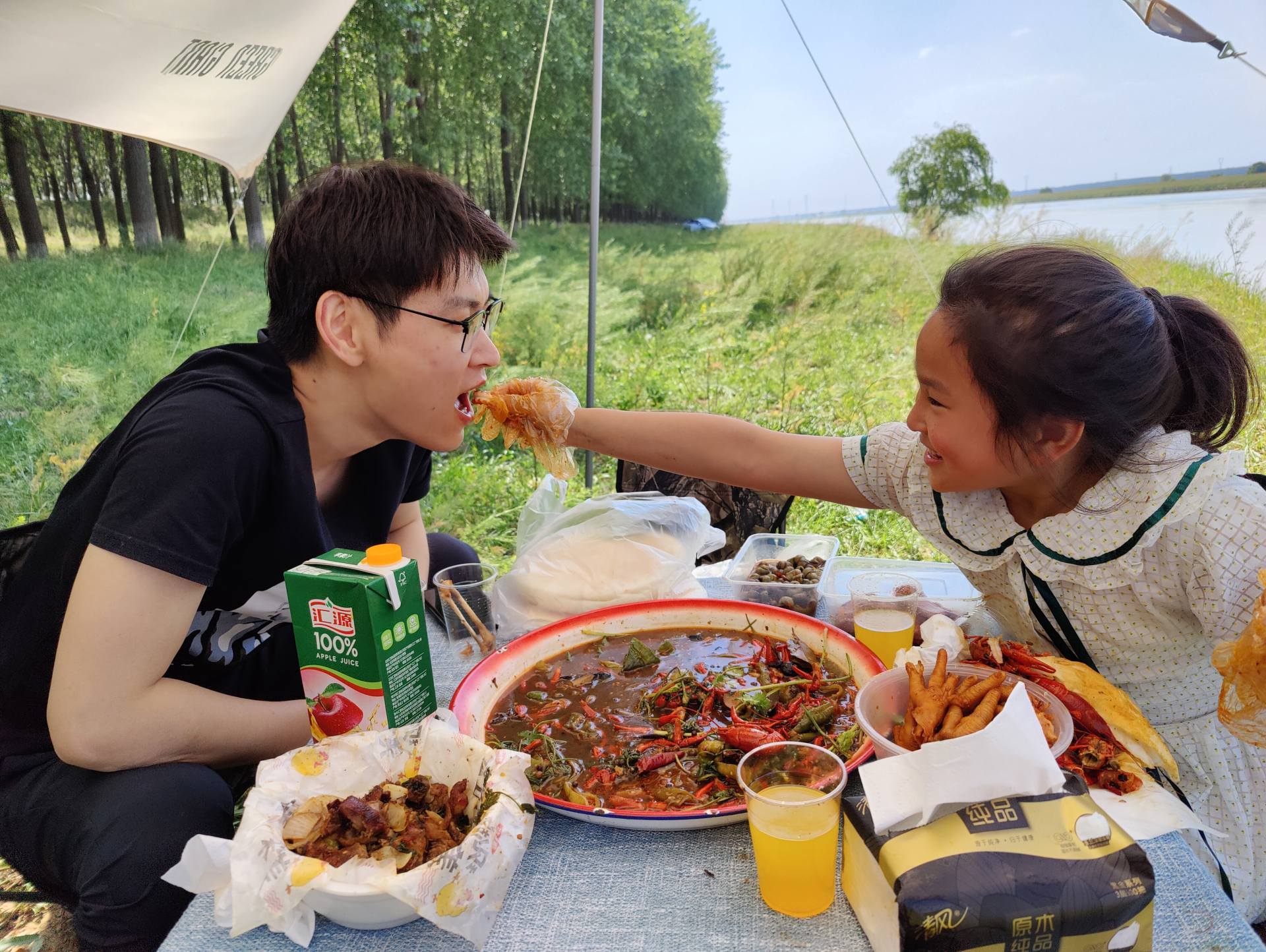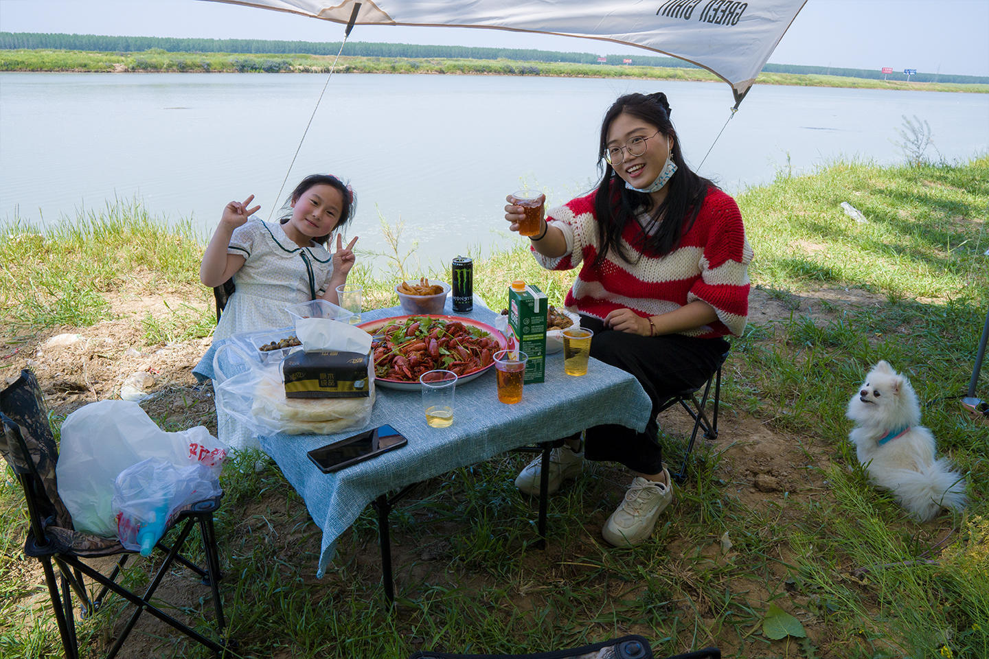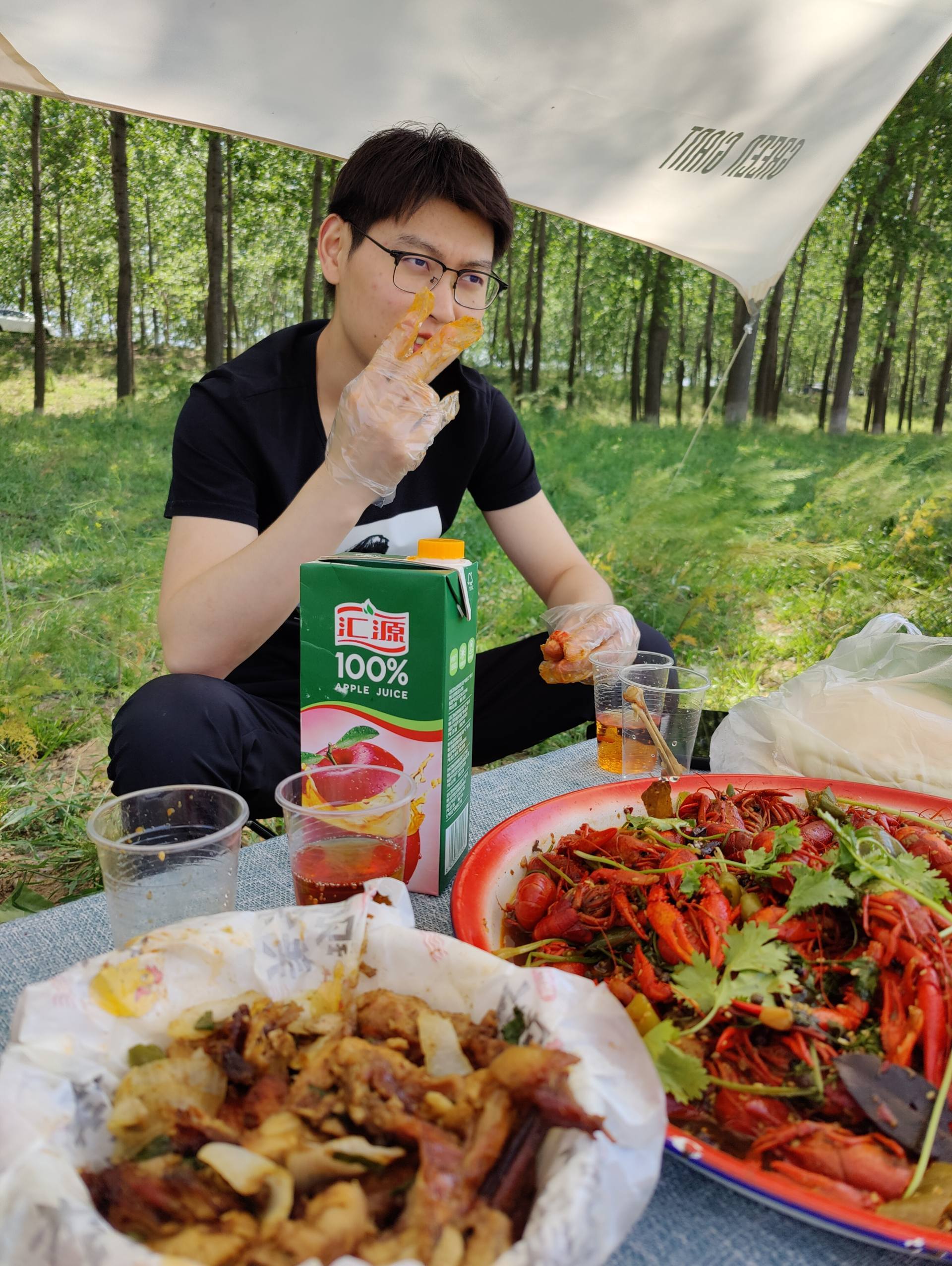 图途户外天幕的尺寸为3*4m,支架高度2.2m,架好后空间非常大,防晒遮阳效果非常棒。图上为下午1点左右,刚刚摆好桌面准备吃饭,小龙虾是昨天烧好的,隔一天腌入味,冷藏后食用非常香。小博美趴在阴凉处也很惬意,出来玩老开心了。