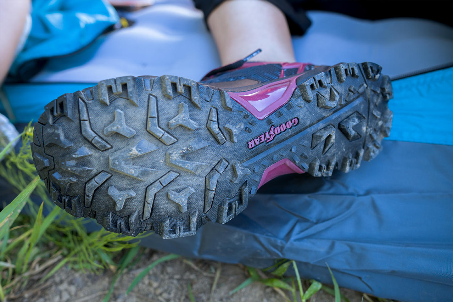 其次防滑性能要好,这款鞋子使用了固特异橡胶材质+大颗粒鹰标纹理,抓地性能非常强 ,而且大间距也不容易卡住砂石,其中心部位还设计了抗扭转腰封,鞋子前后弯曲比较软,左右转动则非常的硬,有效防止扭伤。