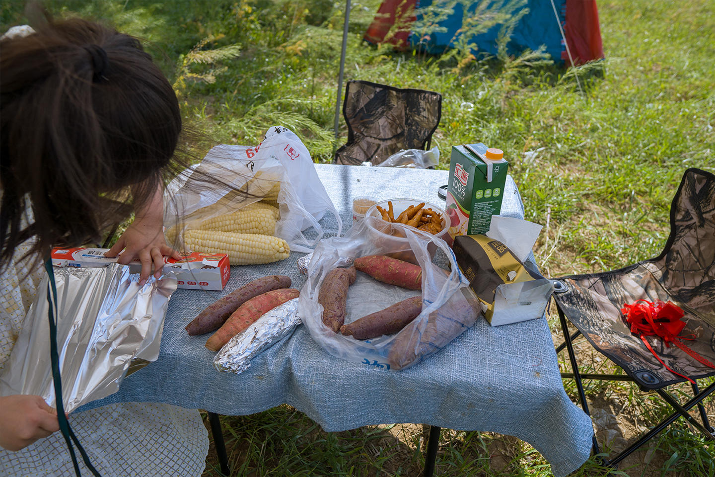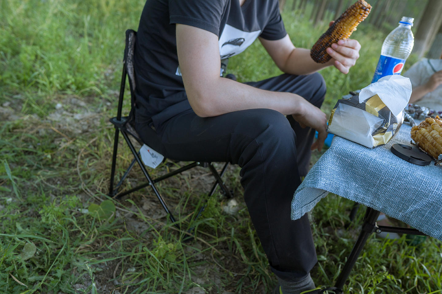 我使用的还是图途家的一套折叠桌椅,本来是想着打牌用的,所以自带了一块桌布,单纯的用来挡挡灰尘啥的也不错,不用担心桌子要清理,回家吧桌布放洗衣机洗一下就好。烤熟的玉米还是滚烫的,闻起来是真香,童年的味道。