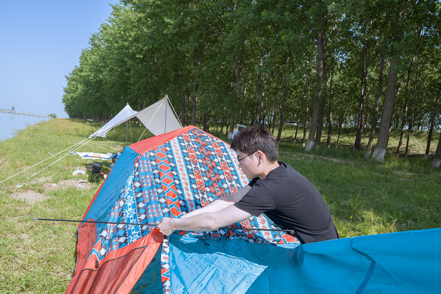 天幕的结构非常简单,搭建也比较快,而帐篷就复杂一点;普通帐篷使用的是合金支架,需要手动穿孔固定,而好一点的帐篷使用的是自动速开支架,有点像打伞一样,直接撑开。