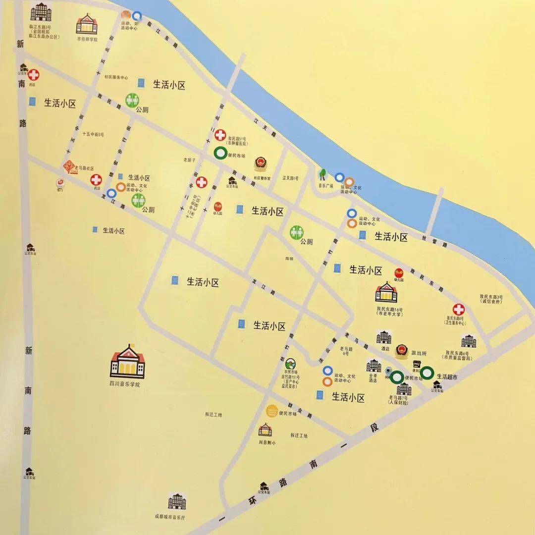 从新南门大桥向东出发,有一大片涵盖了新南路、一环路、致民路、老马路、临江东路、群众路、新生路,由老马路社区、新生路社区、共和路社区合围的扇形生活区域,曾经因成都造纸厂、肥皂厂、假肢厂、耀华食品厂、峨眉交通机械厂、牛奶场等为市民提供生活物资及生活保障的第三产业成堆驻扎而闻名。如今,这些工厂随着城市发展已经慢慢消失或者搬迁。