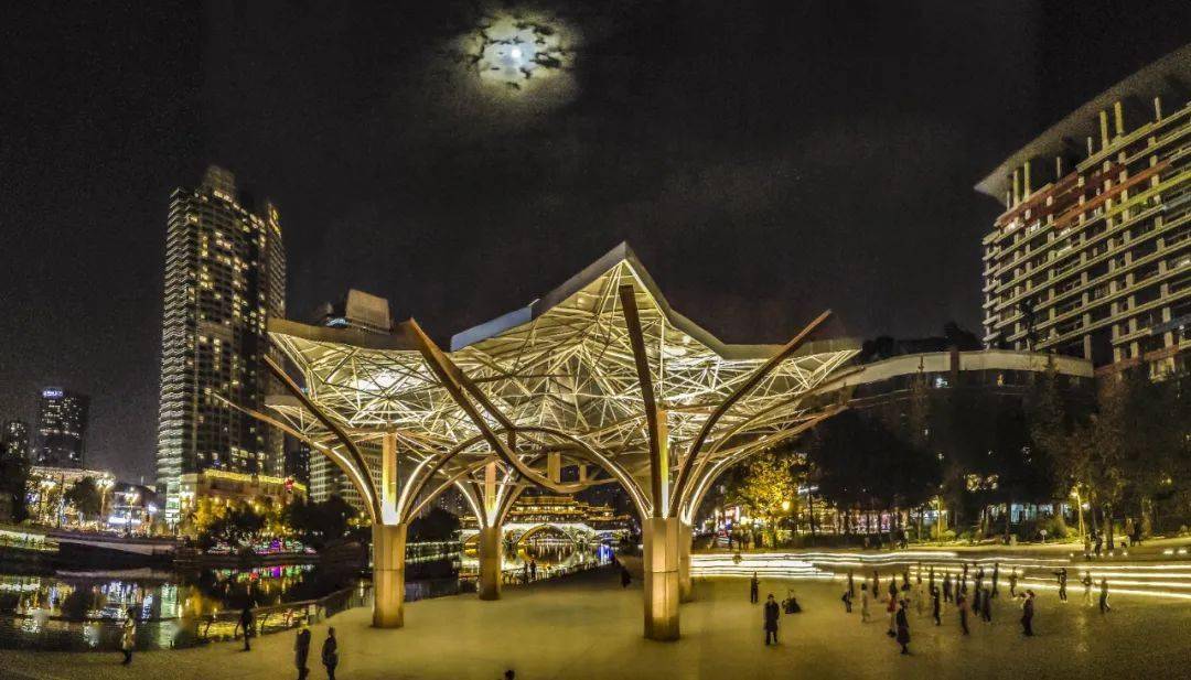 沿着七医院所在的十二街继续向东,从沿河的丝管路向北前行,就是音乐广场是成都市区内最建成的露天音乐广场,如今已经成为热门的临河观景圣地,站在这里,可以欣赏对岸合江亭璀璨夜景。