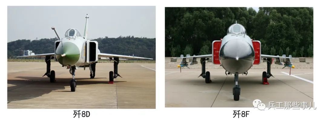 同一视角下的歼-8D和歼-8F飞机,两者的差别主要体现在雷达罩的颜色、机翼上翼刀的数量上