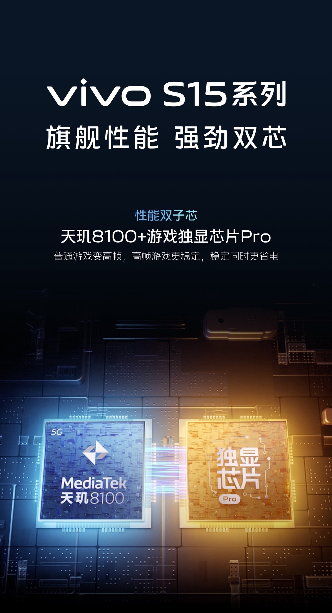我们先说说广受年轻用户期待的性能方面,这次顶级的vivo S15 Pro直接性搭载两颗旗舰级芯片——天玑8100和独显芯片Pro。其实手机多核我们已经司空见惯了,但是对于一颗处理器有两颗芯片,这个就不得不说是非常有创意的了,而且两颗芯片都是旗舰级的。