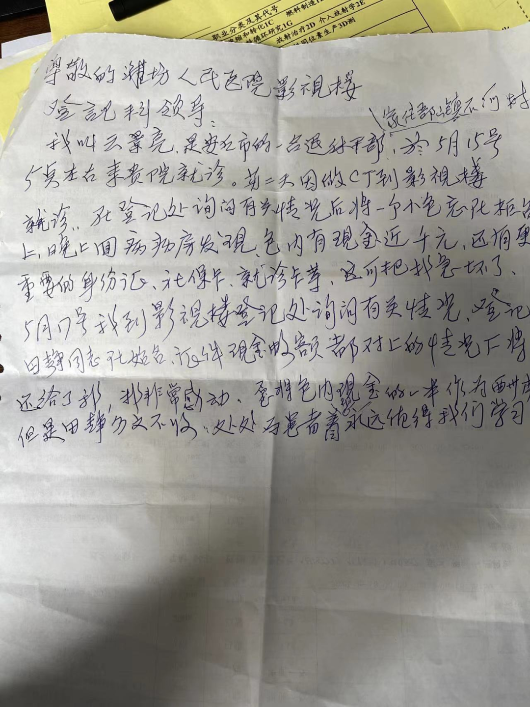 我叫云景亮,是安丘市的一名退休干部,家住郚山镇石河村。我于5月15号5点左右来贵院就诊,在登记处咨询有关情况后,将一个小包忘记在柜台上。晚上回病房后才发现,包内有现金近千元,还有更重要的身份证、社保卡、就诊卡等,这可把我急坏了。5月17号我到影像楼登记处咨询有关情况,登记处田静同志在姓名证件现金数额都对上的情况下,将包还给了我,我非常感动,愿将包内现金一半作为酬谢,但是田静分文不收,处处为患者着想,永远值得我们学习。
