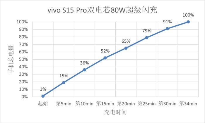 在充电测试中,vivo S15 Pro仅需15分钟就能将1%的电量充至52%,在充电34分钟时就能将手机电量充至100%。