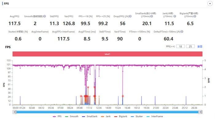 实测,vivo S15 Pro在王者荣耀最高画质120帧的设置下,平均帧率高达117.5帧,除了两局游戏结算,在游戏的进程中帧率表现非常稳定,而且并没有明显下降的趋势。