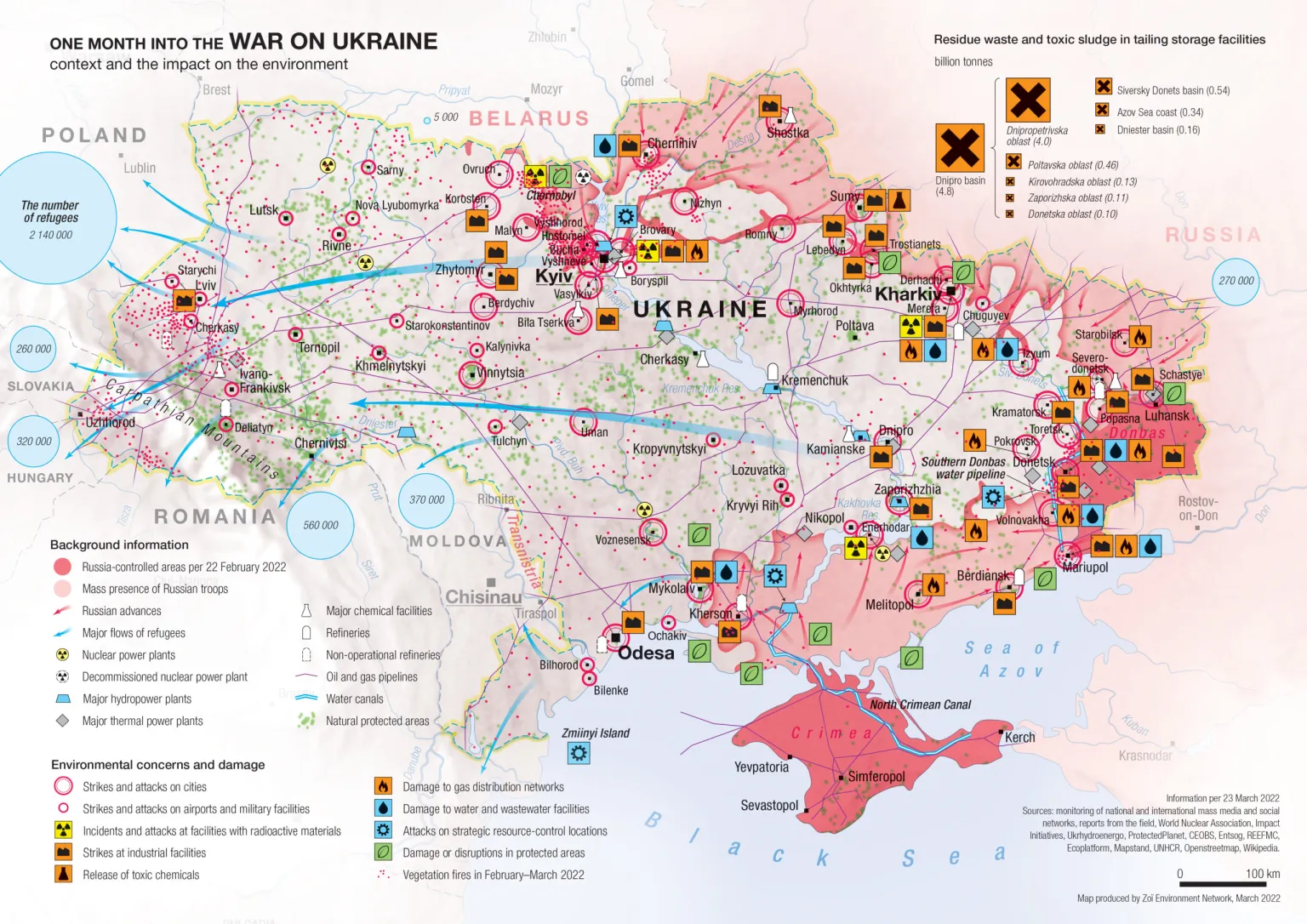 在工业化程度很高的乌克兰,大量的矿山、化工厂、油库、天然气管道等遍布全国。几个煤矿因为战争被迫关闭,现在被酸性矿井排水淹没,却没有人力将水抽出。这些毒素随后会渗入地下水蓄水层,污染周边地区的生活用水。