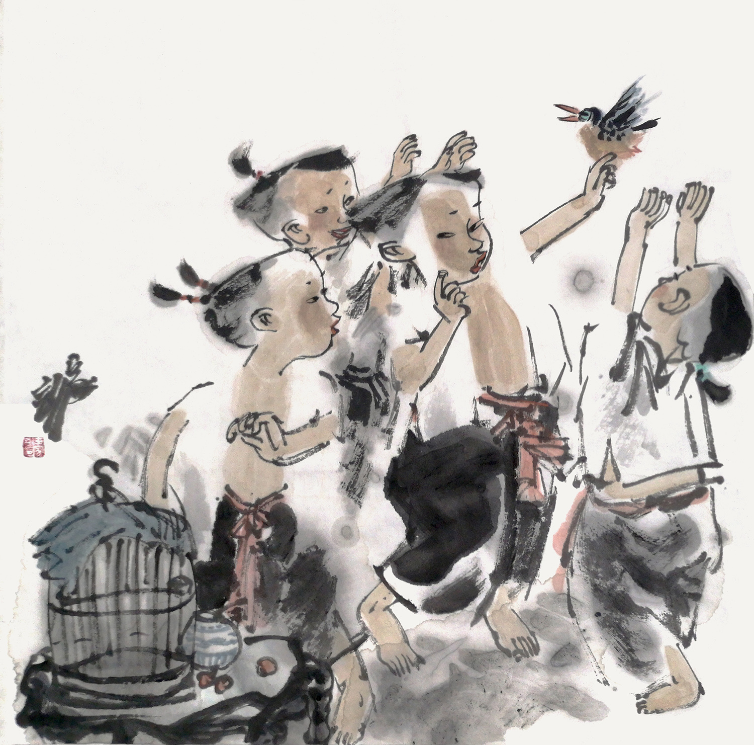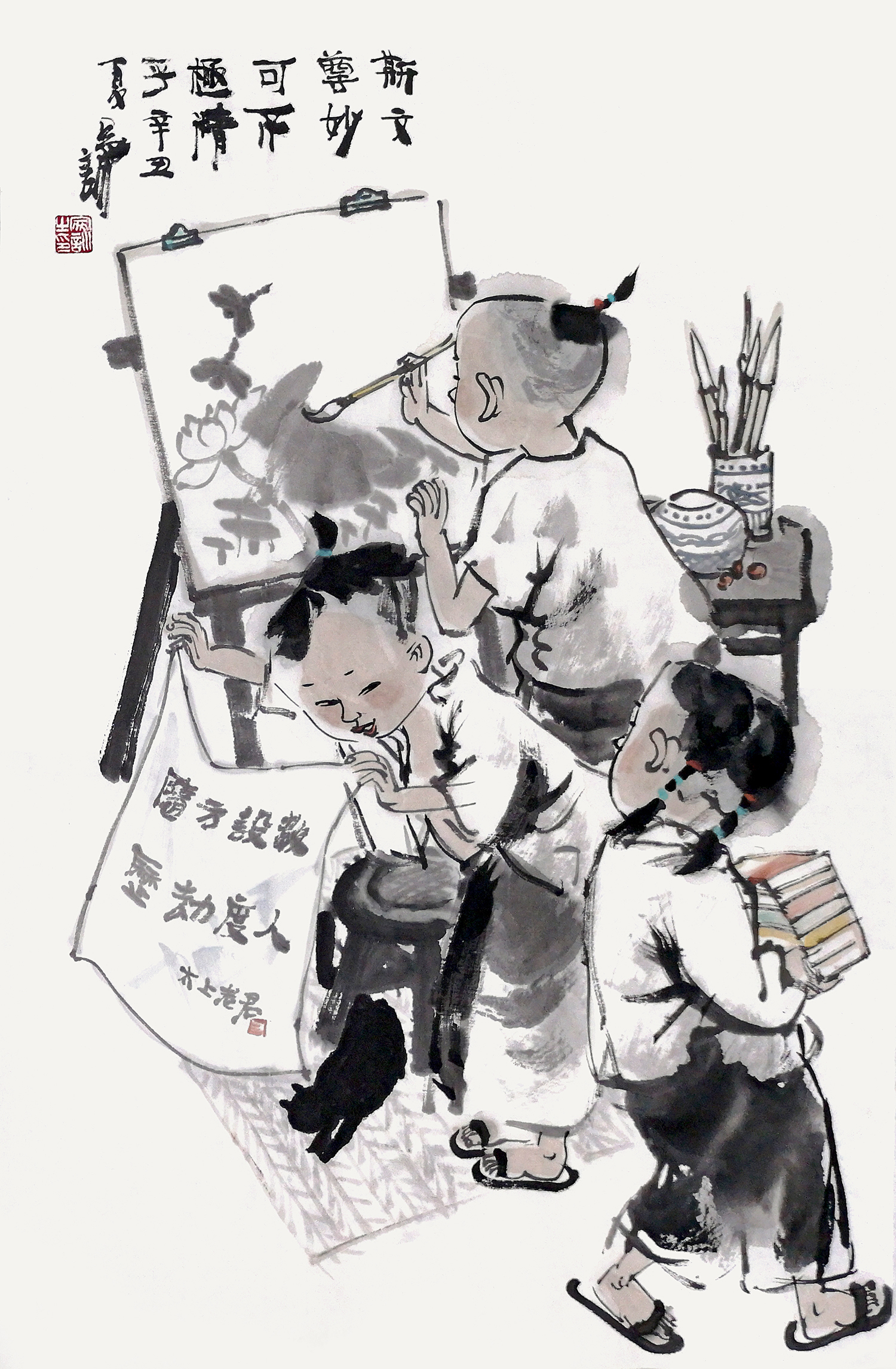 加以恰当的变形,惟妙惟肖地刻画了儿童的天真无邪、活泼可爱,画面清新,富有艺术情趣。